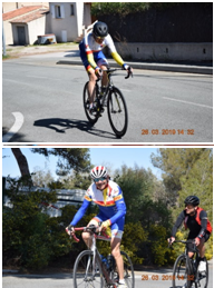 Faute de combattants, les G6 et G7 avaient aujourd'hui décidé de faire cause commune. P'tit Joël ne se sentait plus, il allait enfin pouvoir rouler avec sa cyclote drouaise préférée. Les organisateurs leur avaient concocté un parcours sur mesure, fait de by-pass et raccourcis, histoire de ne pas trop en perdre en route. Mais n'allez pas croire que c'était du gâteau !! 88 km et une D+ dépassant les 1400m, fallait aussi se les farcir. Gilles se privera d'un quart de son gâteau (on ne sait pas lequel) et décidera d'accompagner la conductrice du camion balais pour lui faire la causette jusque Roquebrune : qui va piano va sano dit le proverbe, et ses 1100 m de D+ auront suffi à le retrouver en pleine forme au déjeuner un peu tardif (14h00).