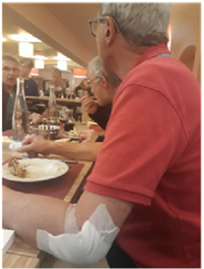Récup' pour tout le monde donc, y compris votre reporter occasionnel ! Allez pour me faire pardonner je vous envoie quelques photos de notre "vie difficile" à Roquebrune (merci aux photographes) ! Mais juste avant, quand même, faut que je vous signale deux chutes parmi les nôtres… enfin, quand je dis chute… on n'est pas loin de vidéo-gag… d'abord Alain qui se vautre lamentablement en essayant de remonter la petite pente vers l'accueil avec le VAE de Madame, à cause d'un ordinateur sous le bras… forcément, bosser ou rouler, il faut choisir Môôôsssieur !! Et Gilles qui se vautre encore plus lamentablement, à l'arrêt, au départ de l'étape du jour. Bilan identique pour ces ceux belges qui s'ignorent : un coude éraflé. Au moins ils le lèveront un peu moins souvent aux repas, car question bibine c'est comme les profils d'étape… ça descend fort chez ces deux-là !