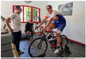 Tout commence lundi soir. Histoire de joindre l'utile au sponsoring, nos organisateurs nous rajoutent tous les soirs, en plus du briefing de l'étape du lendemain, une présentation par l'un de leurs partenaires : punch power dimanche, vélo-fitting lundi, cycles Béraud mardi, plateaux rotor jeudi (…quoique, ce dernier il peut rotorner chez lui car après sondage rapide ça n'intéressait personne !). Velo-fitting (de l'anglais fit, adapter, et du français vélo, vélo) consiste donc à adapter le vélo au cycliste (l'inverse est aussi possible, mais plus couteux). Ayant de longue date souhaité faire une étude posturale digne de ce nom, je trouvais là, enfin, l'occasion rêvée. Non seulement on n'a rien d'autre à foutre les après-midi, mais en plus ils font un prix spécial "stage du soleil" (au lieu d'un œil, ça te coûte juste un bras). Mais bon, faut savoir ce qu'on veut ! Voilà donc rendez-vous pris pour ce mercredi 13h30. Un autre cyclo prendra le créneau suivant (durée 2h). Un belge lui aussi. Comme si tous les français étaient persuadés d'être parfaitement positionnés sur leur vélo (question de culture).