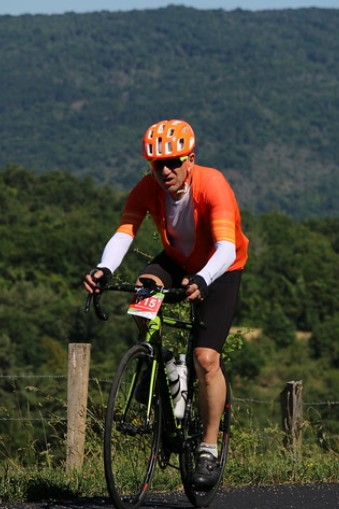 La sortie du plateau s'effectue par une côte d'à peine 5 ou 6%. Rien de rédhibitoire, mais au-delà de l'énergie laissée depuis le début de l'étape, la chaleur se fait de plus en plus pesante. J'accroche la roue de Stéphane en espérant que cela dure. Mais au détour d'un tournant, l'ombre des arbres disparaît, nous laissant sous le soleil de plomb, bitume presque fumant. Je décroche instantanément, et regarde Stéphane s'éloigner inexorablement.