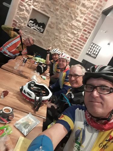 Allez, on repart, pas trop vite. Vernon est en vue : on prendrait bien un petit café… oui mais l'envie d'en finir l'emporte sur le kilomètre supplémentaire qu'il aurait fallu faire pour regagner le centre-ville à la recherche d'une cafetière insomniaque. C'est pas grave, ce sera pour Giverny. Tu parles, à part les fleurs de Claude Monet et le moulin-money des Balkany, y'a pas grand-chose à Giverny. Tant pis, ce sera pour La Roche Guyon. Oui mais avant le café, il y a le dessert : cette petite côte à 10-11%, presque banale sur nos amicales, devient un mur après 360 km. En un claquement de doigt Kaptain est en haut. Moi, pas trop à l'aise sur ce profil, je monte à mon rythme, c'est-à-dire lent. Dans mon rétro, je vois que Valérie met pied à terre et entame la montée à pied sur le bas-côté. Steph hisse tant bien que mal le tandem orphelin dans les premiers mètres de l'ascension. Patrick, qui n'a pas remarqué que ça montait, joue les coach-réconfort. Valérie finira par remonter sur la bécane. Le moral vacille, mais l'honneur est sauf. On plonge sur la Roche à la recherche de ce petit café tant désiré… mais à 7h15 un dimanche, dans cette bourgade pourtant touristique, tout est fermé. On continue, le café attendra. Les kilomètres paraissent des miles. Normal, de ce côté de la Seine on est plus proche de l'Angleterre. Au carrefour de Vétheuil, mes yeux se figent sur le café du coin où je me suis déjà arrêté pour prendre une boisson fraiche les jours de canicule. Zut, fermé lui aussi. Mais juste en face, dans le goulot de cette petite ruelle qui s'enfonce sur la droite, une boulangerie, jusque-là inconnue, projette l'odeur irrésistible de ses viennoiseries toutes fraiches. Et en plus ils font des cafés ! De quoi recharger les batteries pour engloutir les 30 km restants.
