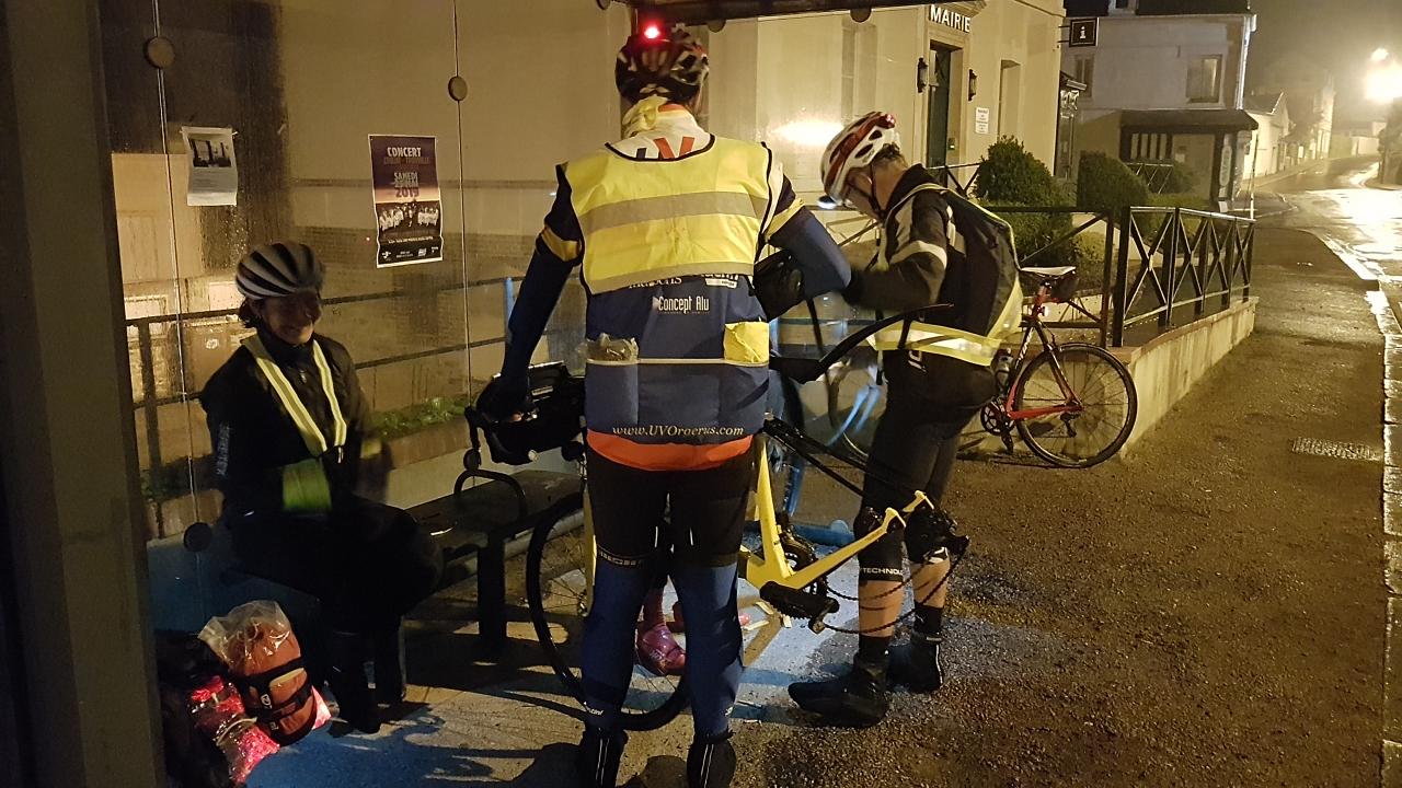 On repart pour le deuxième tronçon, direction Houlgate. La nuit tombe doucement. La pluie, plus fort. Ça roule bien, régulier. Arrivée à Houlgate (km 205) peu avant 23 heures : 29 de moyenne… est-ce bien raisonnable (me dit mon genou) ? On tente de forcer le passage dans une crêperie, mais c'est trop tard, ils ne servent plus. Ce sera donc le café des cyclos (ainsi rebaptisé vu l'affluence du jour), mais rien à manger là non plus. On tape donc dans nos réserves perso en espérant tenir toute la nuit. Valérie enfile sa robe de soirée – comprenez les épaisseurs nécessaires pour traverser les fraicheurs nocturnes.