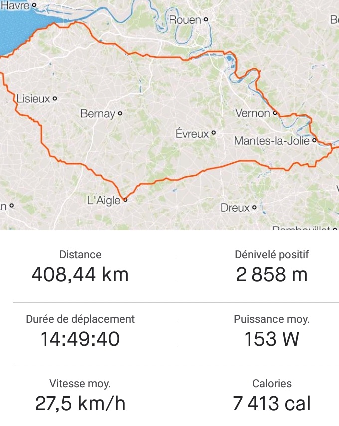 Echaudé par un genou douloureux en fin du BRM300, cette fois je me suis imposé la discipline nécessaire : "K-taping" sur le genou fragile, jambières que je ne quitterai pas, et surtout ne pas forcer sur les 40 premiers kilomètres qui ne sont rien d'autre que les montagnes russes que l'on connait bien : raidard d'Epône suivi du long faux-plat vers Jumeauville, coup de cul de St-Léonard, descente sur Septeuil, remontée sur Dammartin, re-descente sur Ivry-la-bataille et enfin remontée sur La Couture-Boussey. Tout cela avalé le plus souvent dans la roue de Jean-Louis, qui adapte sa cadence à mon rythme prudent. Le tandem gresseyais est un peu derrière, dans l'attente d'un terrain moins propice à l'inertie négative (je compatis). Ils auront vite fait de nous rattraper sur la longue ligne droite peu après St André de l'Eure. On se relaye, ça roule bon train, mais sans forcer. On rattrape même un groupe devant nous. Mais… mais c'est… mais oui… Patrick !? Mais que fait-il là ? L'idée qu'il fut dans un jour moins bien m'aura bien effleuré l'esprit, mais rapidement mon neurone cyclo-moteur me souffle à l'oreille que cette option n'est pas au catalogue. Non, il n'a juste trouvé personne à sa mesure pour faire ce 400 à un rythme de compet'. Donc finalement il roulera avec nous. On balise un peu de devenir ses sparring-partners….