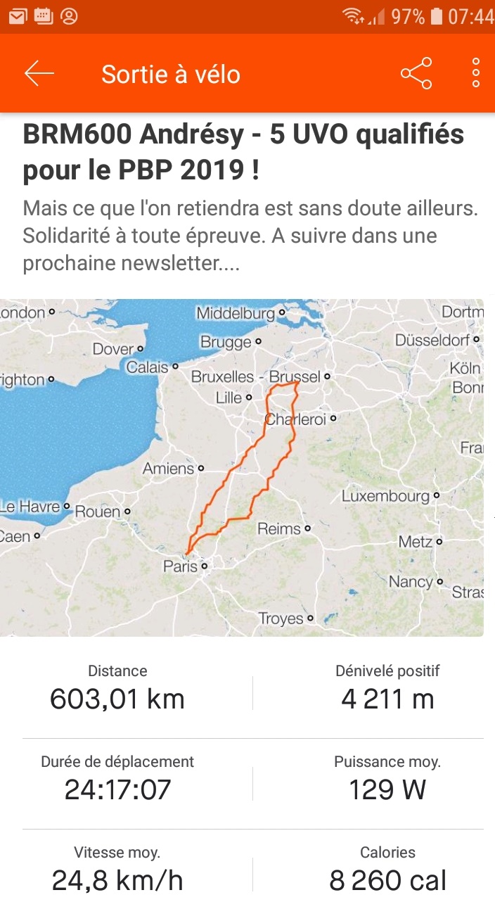 Le vélo est un sport individuel qui se pratique en équipe. Surtout à l'UVO. Bien qu'au vu des conditions de pédalage, ce brevet fut assez difficile nerveusement, cette sortie aura mis en exergue un esprit de solidarité dont je ne soupçonnais pas l'envergure. Certes, je savais le groupe PBP solidaire, mais j'ignorais jusqu'à quel point cette solidarité pouvait se manifester lorsque l'adversité s'acharne. Seul, j'aurais logé à Tournai, et aurais dû remettre ce BRM600 à plus tard. Si je suis arrivé au bout, c'est bien plus à mes camarades que je le dois qu'à mes jambes. Pourtant, personne dans le groupe ne m'a jamais fait ressentir la moindre pointe d'impatience ou de reproche face à mes ennuis mécaniques – certes, ça arrive - et plus encore ma connerie monumentale du bouquet final. Au contraire, chacun aura mis ses compétences techniques et morales au service du groupe, et au mien en particulier, pour que cette aventure collective arrive à son terme, "tous ensemble", malgré l'adversité tenace. Un vrai test, grandeur nature. Merci à Patrick, Jean-Louis, Valérie et Stéphane. Grâce à vous, les 5 UVO sont désormais qualifiés pour le PBP 2019. Maintenant… yapluka…..