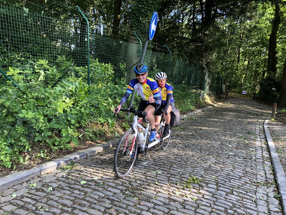 Arrivés au village de Grammont (Flandre orientale, Geraardsbergen en langage local), on tombe nez-à-nez avec un panneau "Muur". En français… pareil ! Des pavés bien rejointoyés, espacés de segments d'un goudron parfaitement lisse, une pente entre 10 et 14%... je me dis que finalement, c'est très surfait le Muur. Oui, sauf que le Muur… c'est pas ça, c'est après !! Tu rentres dans une minuscule ruelle tracée dans la verdure, fermée aux voitures, avec des vrais pavés du nord, irréguliers, et là, la pente se verticalise. Dans le dernier segment, sans doute le plus pentu, le cyclo devant moi perd l'équilibre et tombe. Obligé de m'arrêter. Je finis donc à pied (vu ma vitesse ascensionnelle, ça ne changeait pas grand-chose). C'est de toute façon mieux pour économiser les genoux, il reste 300 bornes à faire…