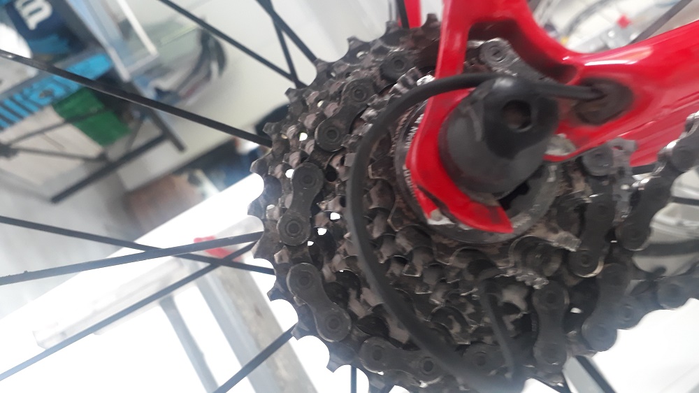 Patrick sort son dérive-chaîne, et me dit calmement : "c'est pas grave, on va raccourcir la chaîne, et tu rouleras sur le même pignon jusqu'à l'arrivée. Vu le profil, on va mettre le petit plateau (un 34) et un pignon intermédiaire".