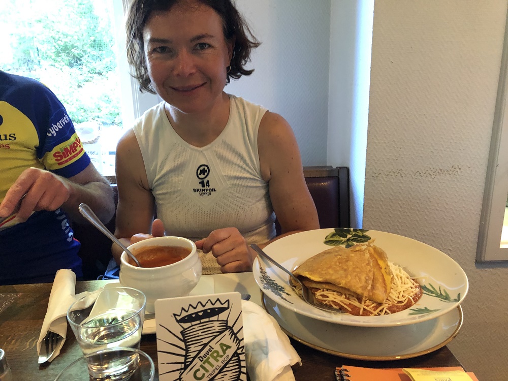 A l'auberge servant de chapeau au Muur, repas de mi-parcours bien mérité : pâtes bolo, soupe tomate, omelette, coca, eau pétillante (de la Chaudfontaine, toute ma jeunesse), café ou thé. On lie conversation à deux braves dames en sortie amicales elles aussi, que l'on mettra un certain temps à convaincre que l'on venait de Paris et qu'on y retournait direct, sans dormir. Faut dire… quand on y pense… faut être une peu barjot….