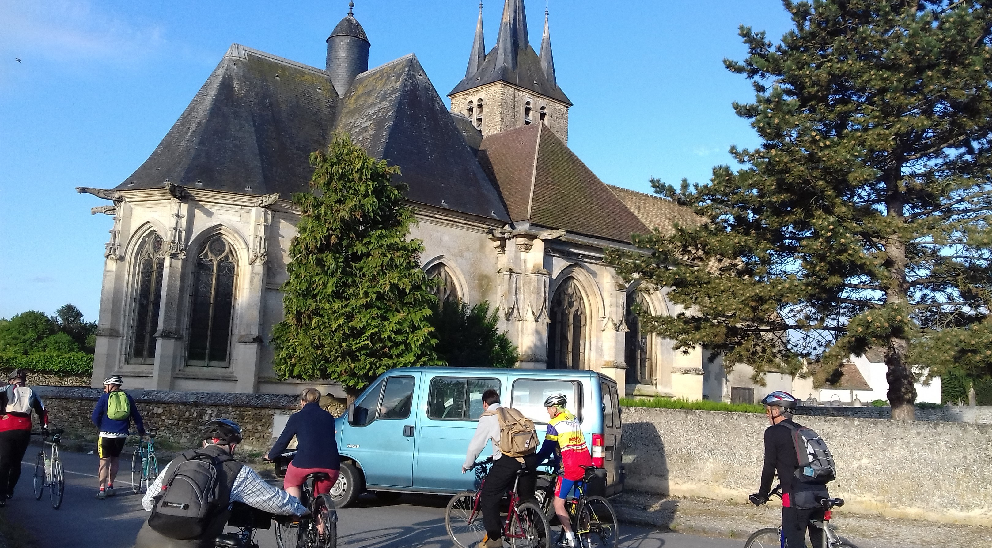 Samedi après-midi, voilà donc notre Steph' parti pour le fléchage des 42 km de balade à vélo, spécialité séculaire de l'UVO. Tout était fin prêt pour un départ de Richebourg à 8 heures pétantes le lendemain. Comme l'année dernière, offices et visites guidées des églises de notre canton alternèrent avec diverses manifestations culturelles, parmi lesquelles une exposition de peintures (Prunay-le-temple) ou un concert a capella (… à Orvilliers en fait !).
