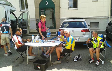 22h50•Céline : Yann et Sylvain étaient très drôles et à fond dans leur rôle d’agent de sécurité au carrefour de Gambais 22h53•Nath : Merci Vincent ! Je suis contente de faire partie de l’aventure ! Et les enfants sont excités aussi ! Lundi 17 Août 1h31•Guillaume : Mortagne au perche… Dur pour moi, bien pour le reste de l’équipe. Je dois manger… 1h38•Chri&Beba : Un far breton de Nath ? Ils ont l’air excellents ! 1h40•Céline : Allez on s’accroche ! 3h13• Sylvain : Allez Guillaume fais tourner le moteur en régime tranquille 3h47•Nath : Levée... pas dormi… trop excitée 7h57 •Thierry E : Je viens de voir votre premier passage à 24.5 de moyenne... Continuez bien et bonne route… 8h15•Christine :•sms•Ils étaient à 05h10 à Villaines-la-Juhel (vitesse moyenne 24,4). Nous sommes partis avec le camping car à 5h15 (15mn de retard sur planning). Nous arriverons à Fougères d'ici 1 h, à peu près en même temps qu'eux ! 8h04•Guillaume : Pause déjeuner a Goron. GPS HS. On est à 35 km de Fougeres 08:20•Christine :•sms•8h07. Arrêt des randonneurs à Goron pour le p’tit déj. Tout est OK. 8h45•Nath : Nous sommes arrivés au point de rdv à fougères. Tout va bien pour nous pour le moment. 8h47•Vincent : Notre abribus avec la pub Leffe? 9h14•Nath : Nous avons installé la table et attendons les cyclistes. Au menu : melon et jambon de Parme, salade de riz, fromage et far Breton… Je ne vous dis pas ce qu’ils vont boire ! 9h15•Christian : La place «handicapés»... 9h20•Nath : On ne monopolise pas la place handicapés, on y a juste installé leur salle de bain ! 9h24•Boudinette : Allez Guigui ! Un far et ça repart ! Non Loïc , Manon et Raph.ne restent jusqu’au bout on vient les chercher ce soir... Vu la téte de Raph… vaut mieux... 9h29•Sylvain : J’ai été impressionné par la vitesse élevée, la variété de bicyclettes et l’absence de signaleurs sur les grosses intersections. 9h40•Céline : Impressionnant tout ces vélos et cette organisation ! Bonne journée aux 4 uvo ainsi qu’aux suiveurs. Une sacrée belle aventure. ! Allez les gars ! 9h48•Loïc : Impressionnant hier à 22h30 la file de vélos à loupiottes entre Châteauneuf et Nogent. Souvenir inoubliable. Allez Serge, Jean Louis, Eric et Guillaume ! 10h04•Yann : Complètement d’accord avec Loïc. Vous auriez dû nous voir avec Sylvain à faire la circulation à Gambais pour que les cyclos puissent franchir ce passage sans danger. Sans parler des gilets fluos laissant croire a des contrôles de gendarmerie ! Un grand moment. Merci encore Sylvain et bon courage aux 4 UVO. (Yann Thomas : époux de Céline, commissaire de course improvisé, et fervent supporter) 10:15•Daniel :•sms• Le team UVO vient de passer à Fougères avec 33' d'avance sur 2011 (avec un vent moins favorable) et 1 h 07 par rapport à 2007… 10h06•Sylvain : Wai on a bien rigolé entre la Mercedès loufoque qui nous a pris pour la brigade des stups et les cafouillages à l’approche des gilets jaunes... 10h14•Lætitia : Glamour 10h15•Aurélie : Dans la salle de bain. Je vois l’ambiance...