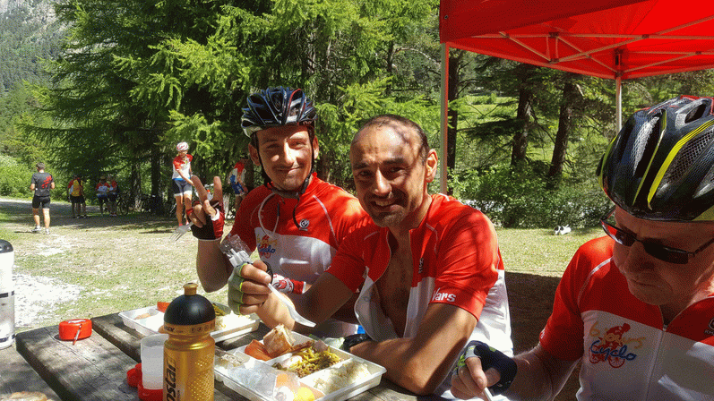 La journée commence par une photo de l’ensemble des participants (limités volontairement à 200) avec le maillot des 6 jours de Vars, puis départ en mode « troupeaux » vers notre première étape : Risoul ! L’UVO prend vite la tête de la 1ère descente avec un Gégé « bille en tête » ! On attaque ensuite la longue montée de la station de Risoul 1850 et là ça devient vite chacun pour sa peau… (14km à 6% de moyenne)… Enfin le sommet avec le 1er ravito, Steven en tête, je le rejoins rapidement, puis Alain à quelques encablures! >Le G1 étant au complet, nous décidons de nous lancer dans la descente avant que la foule des grimpeurs arrivent. Dans la descente des « Salut » « May the force be with you » « bientôt le haut » à nos amis du G2 qui courageusement grimpent encore cette longue première montée vers Risoul. Suit une petite boucle sur les balcons de la Durance sans grande difficulté puis retour vers Vars, avec le col de Vars côté Nord… les 8 premiers kilomètres sont rudes ! Pente à +de 8% voire 10%... Un échauffement qu’ils disaient !! Direction le pique-nique au Val d’Escreins, par une petite route en corniche, enfin du plat (2%) dans un vallon ombragé.