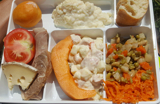 Parenthèse repas : Chacun des « pique-niques » de ce séjour ont été : Gargantuesque ! Œuf, Jambon, viande, légumes, fromage, dessert et fruit ! Boisson à volonté dont du vin à chaque fois ! servis par de nombreux bénévoles toujours souriants ! >