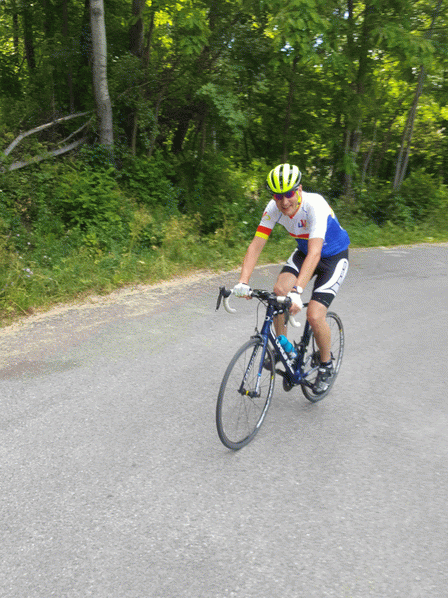 Arrivée dans 11km ! Il fait plus frais et le vent du Nord est fort aujourd’hui. On va l’avoir dans le nez pendant une grande partie de la montée. Les panneaux signalétiques annoncent 9% puis 9,6%... etc… Puis lorsqu’on a un replat (8,5%...) ! Ca grimpe et ça fait mal aux cuisses… puis panneau… 11,1% pour le prochain Kilomètre… Aller hop le 28 gardé en réserve… On sort du 11,1 pour arriver dans un +9% vent pleine tête : Aie ! Aller plus que 3km ! Ça tourne enfin le dos au vent et là des ailes nous poussent !!! OH Miracle je vole.