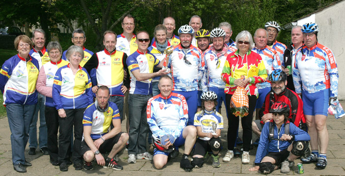 Photo de famille : l'U.C. Flins, club le plus représenté au Rallye des Clochers, se voit remettre la coupe par Patrick, Président de l'UVO. Au bout du bouquet, une fleur de Magnanville, club ayant le plus de dames parmi ses participant(e)s du jour. Au milieu à genou, Germain Galic (9 ans, benjamin Vtt) que son Papa (le colosse en rouge) a eu la bonne idée d'amener jusqu’à 0rgerus (on vous dit à l’année prochaine !). A gauche, quelques un(e)s des adhérent(e)s de l'UVO qui eux (elles) aussi ont mouillé le maillot en ce 5 Mai 2013... |