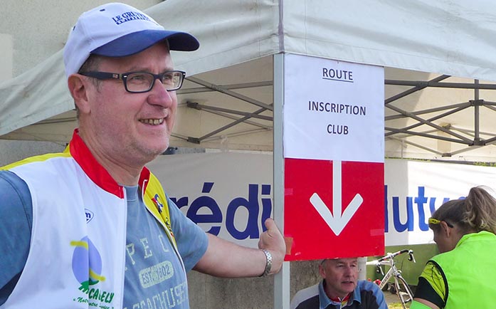Dès potron-minet, le parvis de notre salle du Pré Romain s’encombre de barnums (on craint le coup de soleil), tables, chaises, bancs, affiches, et tout ce qu’il faut pour accueillir nos hôtes du jour dans les meilleures conditions. Le petit café d’accueil et son bout de brioche sont prêts. Dès 6h45, les premiers participants, motivés comme jamais, pointent le bout de leur nez aux tables d’inscription. Puis cela s’enchaine, les uns après les autres… les parkings se remplissent, l’aire d’accueil se mélange des couleurs de tous ces cyclos, adhérents de clubs ou |