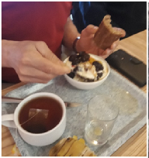 Et bien ce matin, j'ai compris ! Au petit dej', il a une tactique imparable. Il prend un grand bol, il met dedans un peu de tout ce qu'il trouve au buffet – fruits, céréales, pruneaux et j'en passe - il recouvre le tout d'une épaisse rasade de yaourt, et hop tout le monde se dit qu'il est vachement raisonnable le Kap'tain. Mais en réalité, il mange comme 4 !! Après, il se lève à peu près 17 fois pour aller rechercher un bout de baguette, puis deux viennoiseries, puis une banane (j'y reviendrai)… toujours en petite quantité, ni vu ni connu j't'embrouille… Moi si je mangeais la moitié de ce qu'il s'enfile le matin faudrait inventer la chambre à air qui tient 12 bars !