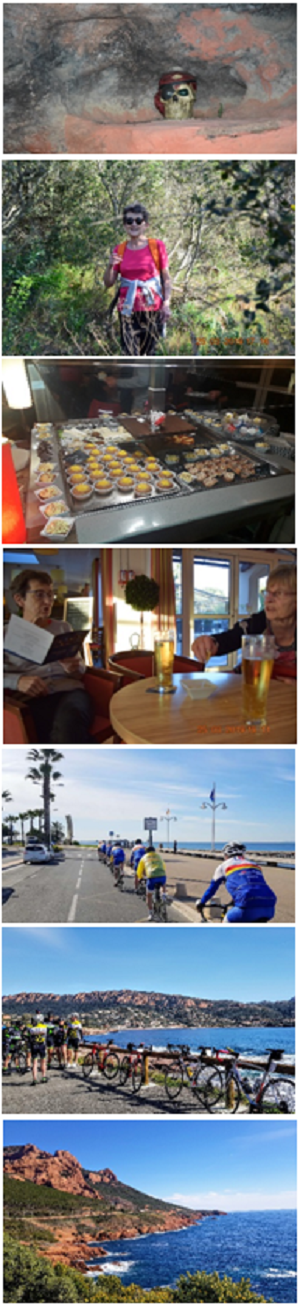 Récup' pour tout le monde donc, y compris votre reporter occasionnel ! Allez pour me faire pardonner je vous envoie quelques photos de notre "vie difficile" à Roquebrune (merci aux photographes) ! Mais juste avant, quand même, faut que je vous signale deux chutes parmi les nôtres… enfin, quand je dis chute… on n'est pas loin de vidéo-gag… d'abord Alain qui se vautre lamentablement en essayant de remonter la petite pente vers l'accueil avec le VAE de Madame, à cause d'un ordinateur sous le bras… forcément, bosser ou rouler, il faut choisir Môôôsssieur !! Et Gilles qui se vautre encore plus lamentablement, à l'arrêt, au départ de l'étape du jour. Bilan identique pour ces ceux belges qui s'ignorent : un coude éraflé. Au moins ils le lèveront un peu moins souvent aux repas, car question bibine c'est comme les profils d'étape… ça descend fort chez ces deux-là !