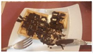 Après l'apéro, on s'est un peu lâchés au repas… faut dire qu'y a pas vélo demain. Personnellement ça fait une semaine que je suis un régime-ascendant vegan, je bouffe que du poisson, de la soupe, 4 kg de légumes et trois yaourts par jour (sans sucre), pas de fromage (ou si peu), mandarine ou raisin comme dessert… Stop ! J'arrête les pâtes aussi (j'ai fait le plein de gasoil, ça devrait suffire pour rentrer), et je me lâche (enfin) sur le dessert, la parait-il fameuse fontaine au chocolat sur des belgian waffles. J'ai goûté, c'est vrai que c'est pas mauvais. Surtout le chocolat.