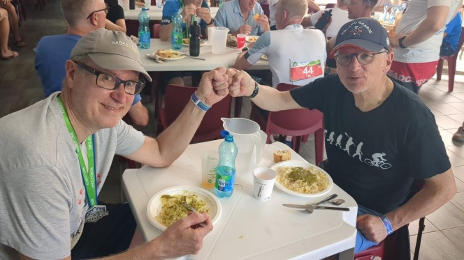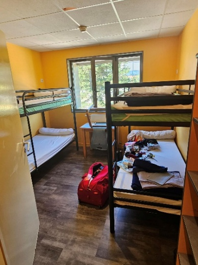 Je déchante quelque peu en découvrant le confort spartiate de ce qui sera notre lieu de repos pour les prochaines 48 heures : une chambre d'une quinzaine de mètres carrés, 4 couchages sur deux lits superposés, une petite étagère par personne, et un coin lavabo – toilette – douche de plein pied (comprenez que l'eau de la douche s'éparpille partout). Des souvenirs de service militaire inconsciemment enfouis dans ma mémoire rejaillissent 37 ans plus tard. A peine le temps de prendre possession d'un couchage et d'installer ma Dream Station Philips (ne fantasmez pas sur de l'audio high-tech, c'est juste l'appareil pour maîtriser les apnées du sommeil), que déjà deux jeunes gaillards (la petite quarantaine) font irruption dans le dortoir. Des bêtes : ils ont fait le grand parcours en à peine 15-20 minutes de plus que moi le petit. Stéphane arrivera un peu plus tard, certes fatigué, mais heureux d'avoir avalé ce premier gros morceau sans défaillance.