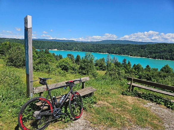 Au-delà de ne pas cramer son cyclo dès le premier jour, le parcours Découverte présente l'avantage de me faire arriver parmi les premiers à notre hébergement, la base nautique de Bellecin, malgré une vitesse moyenne supersonique (21.8 km/h). Cette base nautique est située au bord d'un lac bleu azur à rendre jalouse la côte du même nom (décidément, on parle beaucoup de côtes…). Un environnement paradisiaque que l'on a hâte de connaitre d'avantage, d'autant qu'il signe la fin des souffrances du jour.