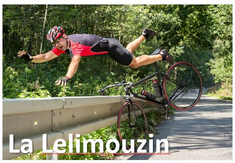 Alors quand le nombre d'options s'effrite… reste l'option belge. Logique ! Dans l'option belge, t'essayes d'abord d'éviter la limule... tu râcles un peu la bordure avec ton dérailleur arrière, et vu le changement de direction assez brutal, tu te retrouves le cul propulsé sur ton cadre… vous savez comme le pros… sauf qu'eux ils savent exactement c'qu'ils font… moi c'était plutôt la version France Gall, avec ton vélo qui te chante : "Viens, je t'emmène… ". Et mon vélo y m'a emmené direct vers la gauche de la route… normal c'est un Time me direz-vous… on reste dans l'ambiance british. Donc c'est plus toi qui dirige le vélo, c'est lui qui te fais visiter, dans une espèce de zig-zag totalement incontrôlé… ouais, parce qu'au moment où je me suis retrouvé devant la limule j'avais les mains en haut du guidon … donc aucune prise sur les freins… heureusement les copains avaient pensé à bloquer la circulation dans les deux sens car si jamais une voiture était venue en face à ce moment-là … ben on rebasculait sur l'option 2… la Lelimouzin… suivez un peu SVP !!!