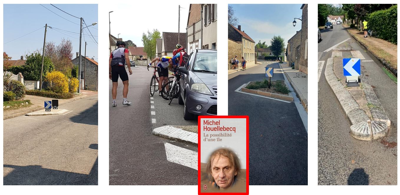 Mais en fait on devrait prendre exemple sur Bazainville. Bah y sont plus intelligents que nous là-bas, c'est pas pour rien que le Président il habite à Baz'. D'ailleurs c'est Kaptain Jean-Louis qui s'occupe des travaux dans la commune, donc y'z'ont fait ça intelligemment. Y z'en ont depuis longtemps de ces machins là… et y z'ont tout compris. D'abord y'a de la végétation, des arbres même, donc c'est vrai que là c'est plus proche du mammouth que de la limule. Et puis surtout y'a des panneaux bien adaptés : t'arrives dessus et t'as la flèche rouge… et si tu vas de l'autre côté… t'as le même panneau… flèche rouge aussi !! "Trop dangereux" y'te disent… n'y vas pas… reste où tu es… mieux… fais demi-tour et passe par un endroit où y en a pas de foutus trucs…. z'ont tout compris à Baz' j'vous dis…