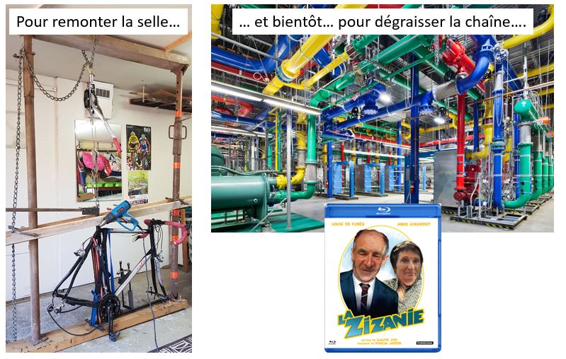 Et enfin Messieurs Dames je ne résiste pas à l'envie de vous montrer le dernier montage de notre mécano en chef, j'ai nommé Daniel bien entendu. Voici ce qu'il a installé cette année dans son garage… vous voyez, il y a des poutres, des palans, des chaines, des sangles, des leviers, des serre-joints, un thermo-souffleur … et tout cela Messieurs Dames je vous l'donne en mille… c'est pour remonter la selle de son vélo qui était un petit peu grippée….. !!!