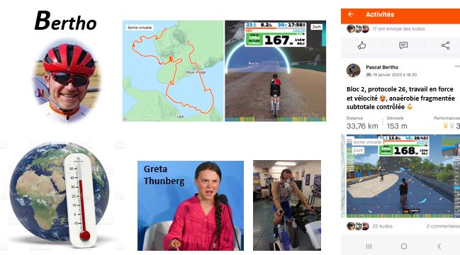 En général y sort pas de chez lui en dessous de 37 degrés le Bertho. Autant dire qu'on le croise pas souvent. Au mieux entre mi-juillet et mi-Août. Le reste du temps il fait des stages en Espagne… Mais pas avant juin hein, trop froid. Les 8 autres mois de l'année il affute ses mollets sur des sites virtuels dans son garage… chauffage à fond et porte du garage fermée. Pour pas qu'y ait de vent. Parce qu'y ventorégule pas non plus le Bertho. Muté j'vous dis. Mais dans son garage y suit des programmes d'entrainement hyper sophistiqués… Là ça devait être du triathlon je suppose… ou alors c'était une initiation à la paléontologie je sais pas…