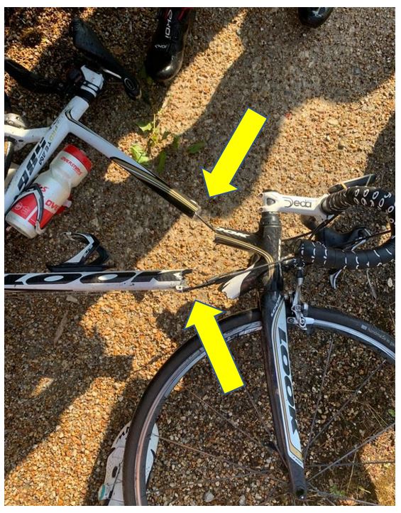 Et la Véro lui répondit sur un ton autoritaire : "Oh tu chicanes là !". Mais il a pas bien compris le Pascal, et à la première chicane venue il s'est exécuté… et ce fut assez violent. Même les bordures en béton elles ont bougé, c'est vous dire. Et on voit encore les traces de sang. Par terre là… sur le mollet c'est un tatouage imitation gamelle sur Christophe Fraigneau. Le Pascal il nous a fait un beau roulé Boulez, et heureusement qu'il avait le casque. Enfin, c'est pas non plus pour c'qui a à protéger me direz-vous ! Quant à la bonneterie… oooh putaaaain… !!! Enfin, pour rester poli on noret pas fait mieux.…. Ah c'est pour les initiés aujourd'hui… comme dirait Jean-Claude Van Damme : "pour comprendre, faut être AWARE… Design… ". Hahaha… l'humour belge ça peut aussi être subtil parfois. Mais malgré cette grosse gamelle l'ami Pascal était ravi car le changement de look de son vélo ne lassait aucun doute qu'un nouveau Look était indispensable. Et aujourd'hui il roule sur un beau vélo tout neuf !!