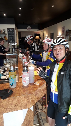 Allez, on repart, pas trop vite. Vernon est en vue : on prendrait bien un petit café… oui mais l'envie d'en finir l'emporte sur le kilomètre supplémentaire qu'il aurait fallu faire pour regagner le centre-ville à la recherche d'une cafetière insomniaque. C'est pas grave, ce sera pour Giverny. Tu parles, à part les fleurs de Claude Monet et le moulin-money des Balkany, y'a pas grand-chose à Giverny. Tant pis, ce sera pour La Roche Guyon. Oui mais avant le café, il y a le dessert : cette petite côte à 10-11%, presque banale sur nos amicales, devient un mur après 360 km. En un claquement de doigt Kaptain est en haut. Moi, pas trop à l'aise sur ce profil, je monte à mon rythme, c'est-à-dire lent. Dans mon rétro, je vois que Valérie met pied à terre et entame la montée à pied sur le bas-côté. Steph hisse tant bien que mal le tandem orphelin dans les premiers mètres de l'ascension. Patrick, qui n'a pas remarqué que ça montait, joue les coach-réconfort. Valérie finira par remonter sur la bécane. Le moral vacille, mais l'honneur est sauf. On plonge sur la Roche à la recherche de ce petit café tant désiré… mais à 7h15 un dimanche, dans cette bourgade pourtant touristique, tout est fermé. On continue, le café attendra. Les kilomètres paraissent des miles. Normal, de ce côté de la Seine on est plus proche de l'Angleterre. Au carrefour de Vétheuil, mes yeux se figent sur le café du coin où je me suis déjà arrêté pour prendre une boisson fraiche les jours de canicule. Zut, fermé lui aussi. Mais juste en face, dans le goulot de cette petite ruelle qui s'enfonce sur la droite, une boulangerie, jusque-là inconnue, projette l'odeur irrésistible de ses viennoiseries toutes fraiches. Et en plus ils font des cafés ! De quoi recharger les batteries pour engloutir les 30 km restants.