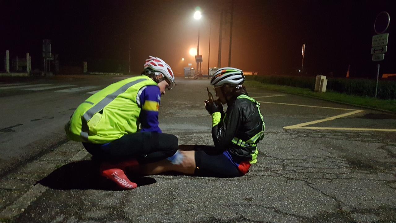 On repart pour le deuxième tronçon, direction Houlgate. La nuit tombe doucement. La pluie, plus fort. Ça roule bien, régulier. Arrivée à Houlgate (km 205) peu avant 23 heures : 29 de moyenne… est-ce bien raisonnable (me dit mon genou) ? On tente de forcer le passage dans une crêperie, mais c'est trop tard, ils ne servent plus. Ce sera donc le café des cyclos (ainsi rebaptisé vu l'affluence du jour), mais rien à manger là non plus. On tape donc dans nos réserves perso en espérant tenir toute la nuit. Valérie enfile sa robe de soirée – comprenez les épaisseurs nécessaires pour traverser les fraicheurs nocturnes.