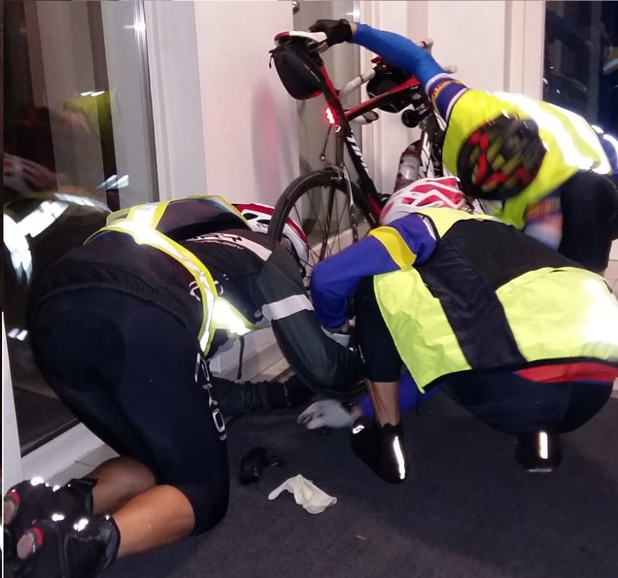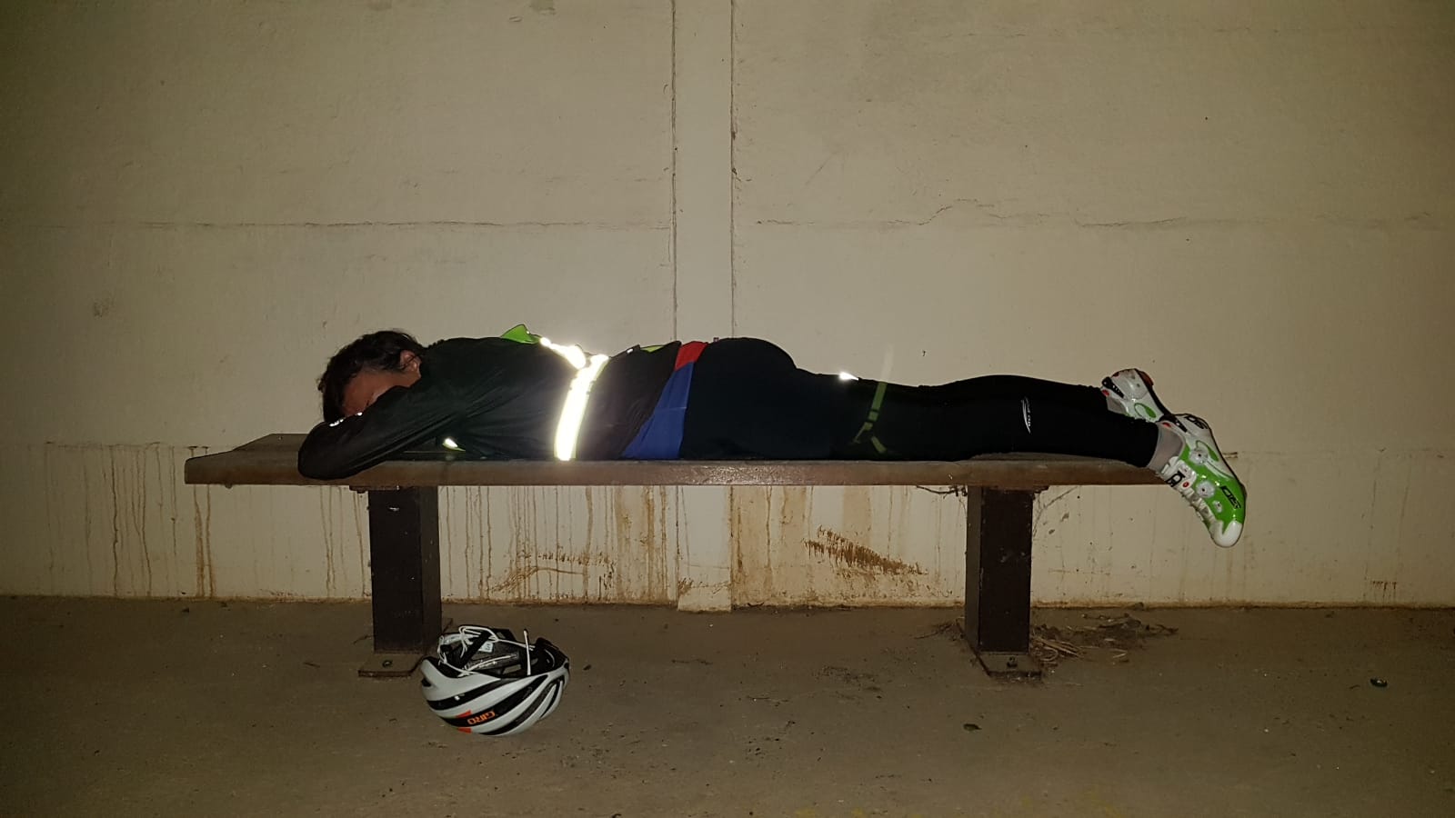 Un peu plus loin, alors que je roulais un peu devant, je me retourne, plus personne. Je m'arrête, j'attends. Je vois arriver des phares, ce doit être eux. Raté, deux cyclos que l'on avait vus à Grammont. Je téléphone à Kaptain, à Patrick, à Valérie. Pas de réponse. J'envoie SMS et Whatsapp. Pas de réponse. Je fais demi-tour, je reviens sur quelques centaines de mètres, toujours personne. Je commence à me dire que la loi des séries a décidé de jouer avec me nerfs. Puis Jean-Louis m'appelle : "Valérie s'endormait à l'arrière du tandem, on s'est arrêtés, ils pioncent tous sous un abribus". Je remonte donc plus loin encore, pour enfin les trouver. Alors que je m'apprêtais à ouvrir ma cannette de coca achetée à Tournai, tout le monde se relève d'un coup et enfourche son vélo. Le coca, attendra. Jusqu'au début du jour, Valérie oscillera entre somnolence, bâillements et arrêts forcés pour dormir un peu. Chacun ses merdes…. mais les solutions sont collégiales !!