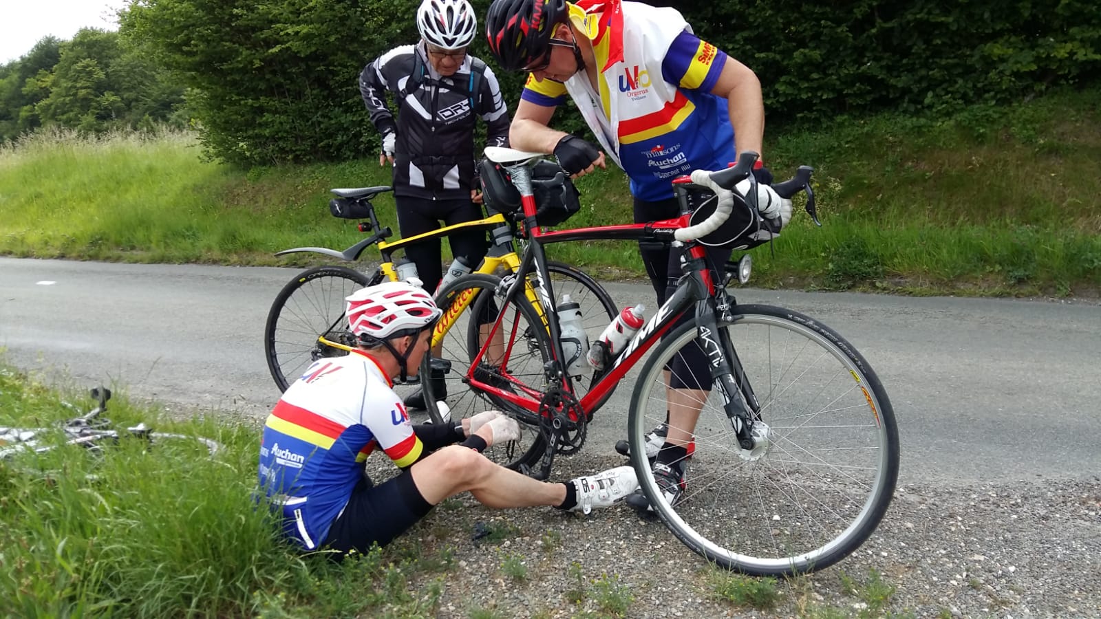 Et là, patatras! Il n'est restait qu'un… Instantanément, la chape se fait tutoyer par les rayons de la roue en mouvement, et je vois mon dérailleur passer à hauteur de mon épaule et me doubler (certes je n'allais pas vite) dans un mouvement elliptique. Arrêt instantané évidemment, chaine pendouillant dans le vide ! "Mais quel con" crierai-je à forts décibels. Faut dire que j'ai tenu quasi 12 heures sans passer ce fichu pignon, et là, à cause de la fatigue ou des verres vieillissants de mes lunettes de sport (ou les deux mon capitaine), je fais le truc à ne pas faire. De rage, j'envoie mon dérailleur (avec le bout de patte arrachée) dans le pré d'à côté (Jean-Louis ira le recherche). Mais quel con !!