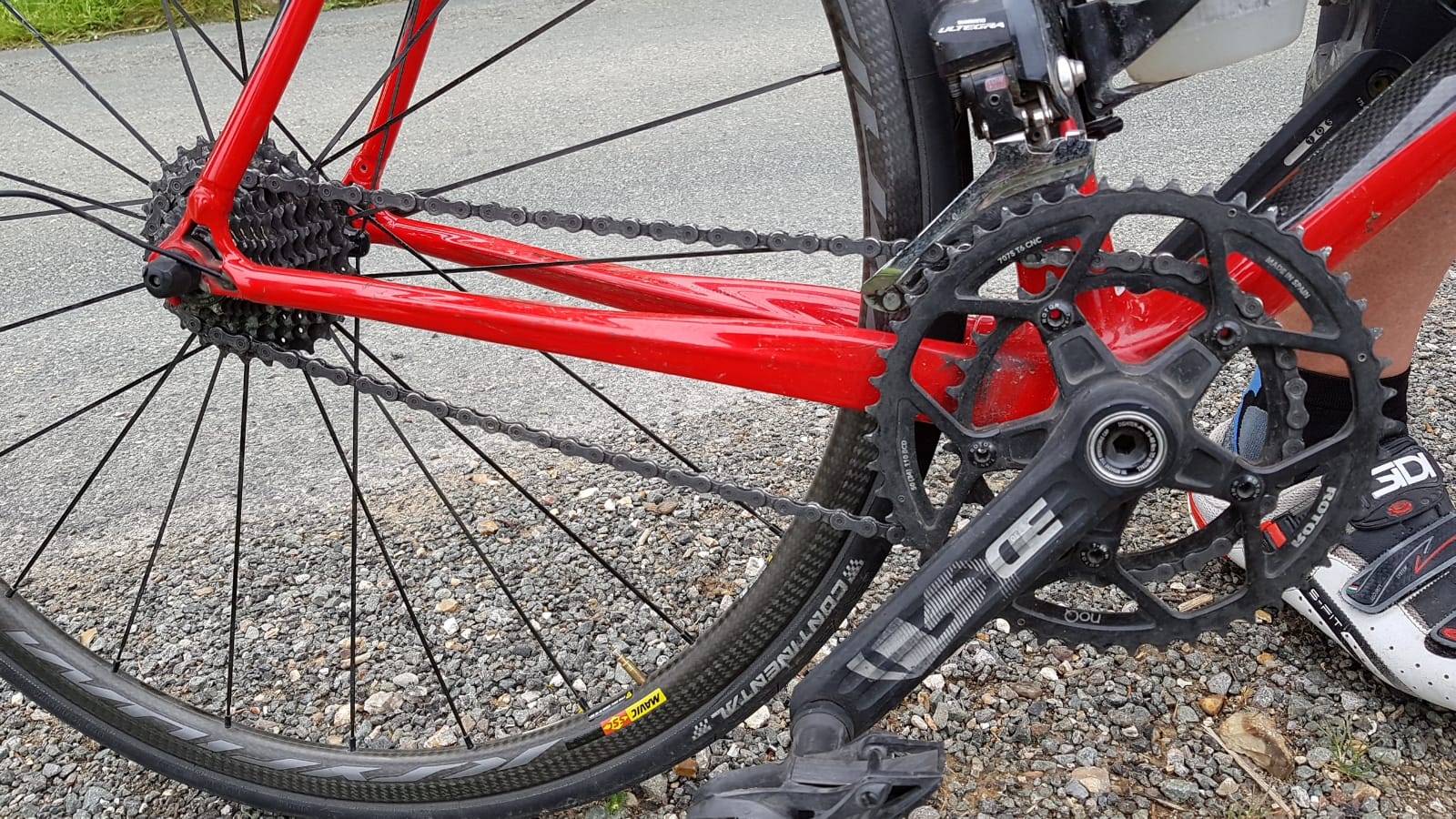 Patrick sort son dérive-chaîne, et me dit calmement : "c'est pas grave, on va raccourcir la chaîne, et tu rouleras sur le même pignon jusqu'à l'arrivée. Vu le profil, on va mettre le petit plateau (un 34) et un pignon intermédiaire".