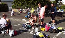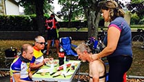 22h50•Céline : Yann et Sylvain étaient très drôles et à fond dans leur rôle d’agent de sécurité au carrefour de Gambais 22h53•Nath : Merci Vincent ! Je suis contente de faire partie de l’aventure ! Et les enfants sont excités aussi ! Lundi 17 Août 1h31•Guillaume : Mortagne au perche… Dur pour moi, bien pour le reste de l’équipe. Je dois manger… 1h38•Chri&Beba : Un far breton de Nath ? Ils ont l’air excellents ! 1h40•Céline : Allez on s’accroche ! 3h13• Sylvain : Allez Guillaume fais tourner le moteur en régime tranquille 3h47•Nath : Levée... pas dormi… trop excitée 7h57 •Thierry E : Je viens de voir votre premier passage à 24.5 de moyenne... Continuez bien et bonne route… 8h15•Christine :•sms•Ils étaient à 05h10 à Villaines-la-Juhel (vitesse moyenne 24,4). Nous sommes partis avec le camping car à 5h15 (15mn de retard sur planning). Nous arriverons à Fougères d'ici 1 h, à peu près en même temps qu'eux ! 8h04•Guillaume : Pause déjeuner a Goron. GPS HS. On est à 35 km de Fougeres 08:20•Christine :•sms•8h07. Arrêt des randonneurs à Goron pour le p’tit déj. Tout est OK. 8h45•Nath : Nous sommes arrivés au point de rdv à fougères. Tout va bien pour nous pour le moment. 8h47•Vincent : Notre abribus avec la pub Leffe? 9h14•Nath : Nous avons installé la table et attendons les cyclistes. Au menu : melon et jambon de Parme, salade de riz, fromage et far Breton… Je ne vous dis pas ce qu’ils vont boire ! 9h15•Christian : La place «handicapés»... 9h20•Nath : On ne monopolise pas la place handicapés, on y a juste installé leur salle de bain ! 9h24•Boudinette : Allez Guigui ! Un far et ça repart ! Non Loïc , Manon et Raph.ne restent jusqu’au bout on vient les chercher ce soir... Vu la téte de Raph… vaut mieux... 9h29•Sylvain : J’ai été impressionné par la vitesse élevée, la variété de bicyclettes et l’absence de signaleurs sur les grosses intersections. 9h40•Céline : Impressionnant tout ces vélos et cette organisation ! Bonne journée aux 4 uvo ainsi qu’aux suiveurs. Une sacrée belle aventure. ! Allez les gars ! 9h48•Loïc : Impressionnant hier à 22h30 la file de vélos à loupiottes entre Châteauneuf et Nogent. Souvenir inoubliable. Allez Serge, Jean Louis, Eric et Guillaume ! 10h04•Yann : Complètement d’accord avec Loïc. Vous auriez dû nous voir avec Sylvain à faire la circulation à Gambais pour que les cyclos puissent franchir ce passage sans danger. Sans parler des gilets fluos laissant croire a des contrôles de gendarmerie ! Un grand moment. Merci encore Sylvain et bon courage aux 4 UVO. (Yann Thomas : époux de Céline, commissaire de course improvisé, et fervent supporter) 10:15•Daniel :•sms• Le team UVO vient de passer à Fougères avec 33' d'avance sur 2011 (avec un vent moins favorable) et 1 h 07 par rapport à 2007… 10h06•Sylvain : Wai on a bien rigolé entre la Mercedès loufoque qui nous a pris pour la brigade des stups et les cafouillages à l’approche des gilets jaunes... 10h14•Lætitia : Glamour 10h15•Aurélie : Dans la salle de bain. Je vois l’ambiance...