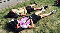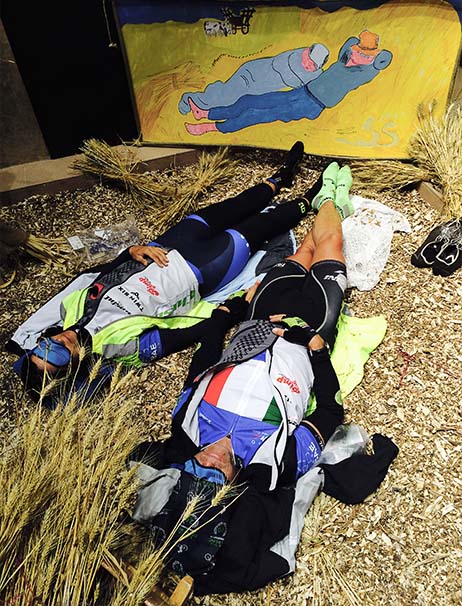 0h14•Aurélie : Surréaliste ... 0h16•Nath : C’est le mot juste. On vient de ramasser un gars tombé du vélo au ralenti en arrivant au contrôle de Carrhaix... épuisé il n’a pas réussi à descendre de vélo… 0h18•Yann :Il va comment? 0h19•Nath : Un peu sonné ... il va se reposer et manger. 00h45•Jany :•sms•Eric a une douleur à l’épaule ? Celle qu'il avait déjà eue ? 00h46•Christine :•sms•Oui et il est fatigué. On va les faire dormir 1 heure.