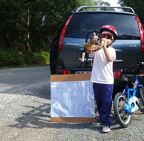 Spontanément, et contre toute attente, Tony Gallopin, a répondu en promettant une visite après le Tour. Et, effectivement, il est venu rendre visite à Antoine, avec son épouse, Marion Rousse (championne cycliste, elle aussi). Il a promis de venir rouler avec lui à Bazainville. Antoine est aux anges! Sur la photo Antoine est à Gambais pour supporter les bresteurs… Il porte des lunettes offertes par Tony Gallopin, qui lui a aussi offert son équipement du Tour de France. Nous admirons tous Tony pour son caractère de champion et son intelligence de la course. Que dire qui pourrait être à la hauteur de l’émotion qu’ils ont soulevée, lui et sa Marion ? Merci !