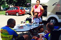 On n’est pas des suiveurs puisqu’on arrive toujours avant. 23:04•Christian : Good night 23:18•Vincent : Pas mieux 23:53•Céline : Allez les gars, allez Guillaume, dernière nuit, votre prochaine sera dans un vrai lit, lespieds en éventail, la tête pleine de souvenirs ! C’est une énorme aventure pour tous, cyclistes et suiveurs. Bravo ! Respect les garçons ! Allez on pédale, vous approchez l’arrivée PS : Guillaume, le Tom Sawyer du camping car il va falloir que tu habitues tes pieds aux chaussures car cela te joue de mauvais tours.