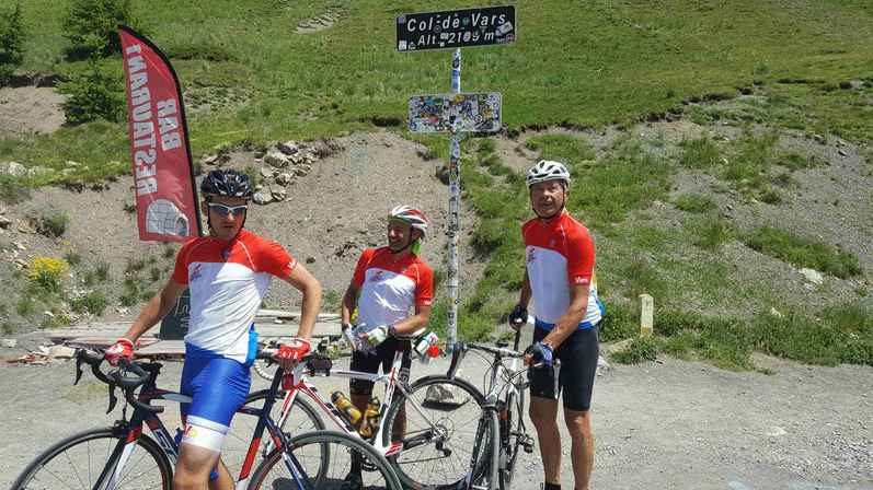 La journée commence par une photo de l’ensemble des participants (limités volontairement à 200) avec le maillot des 6 jours de Vars, puis départ en mode « troupeaux » vers notre première étape : Risoul ! L’UVO prend vite la tête de la 1ère descente avec un Gégé « bille en tête » ! On attaque ensuite la longue montée de la station de Risoul 1850 et là ça devient vite chacun pour sa peau… (14km à 6% de moyenne)… Enfin le sommet avec le 1er ravito, Steven en tête, je le rejoins rapidement, puis Alain à quelques encablures! >Le G1 étant au complet, nous décidons de nous lancer dans la descente avant que la foule des grimpeurs arrivent. Dans la descente des « Salut » « May the force be with you » « bientôt le haut » à nos amis du G2 qui courageusement grimpent encore cette longue première montée vers Risoul. Suit une petite boucle sur les balcons de la Durance sans grande difficulté puis retour vers Vars, avec le col de Vars côté Nord… les 8 premiers kilomètres sont rudes ! Pente à +de 8% voire 10%... Un échauffement qu’ils disaient !! Direction le pique-nique au Val d’Escreins, par une petite route en corniche, enfin du plat (2%) dans un vallon ombragé.