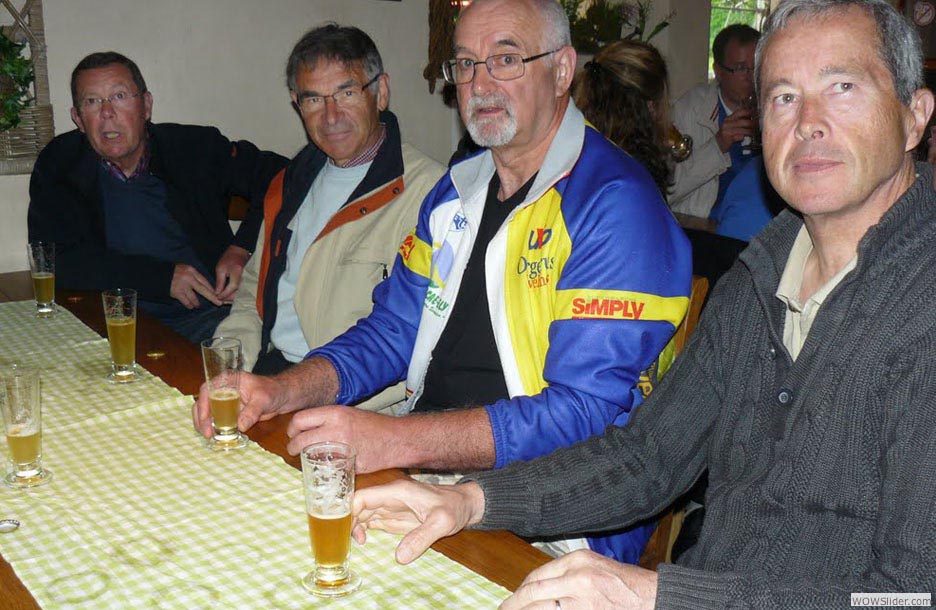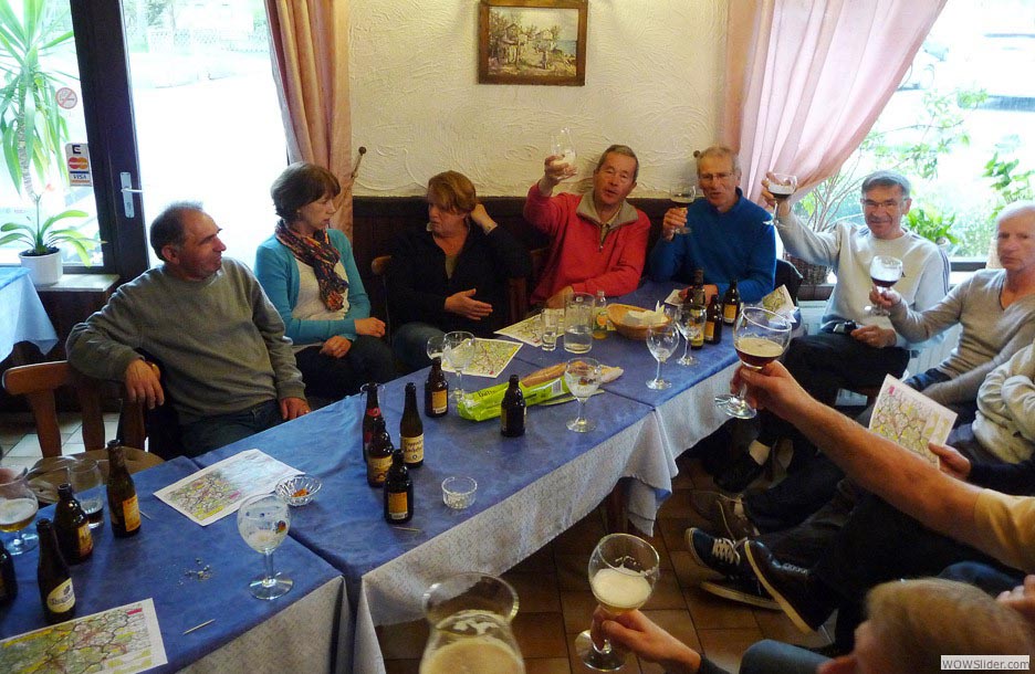 sans rire il doit pleuvoir de temps en temps, ici… une population avenante et chaleureuse, appréciant le vélo et les cyclistes… une architecture en pleine évolution avec de solides maisons de pierres gris-bleu, et ocres et siennes… des jardins ouverts, sans clôtures ni murs… un amour fou de l’art topiaire, du gazon coupé en brosse, des résineux… des vaches angora du crazy horse avec des mèches blondes qui traînent par terre, et des cornes en guidon de Vtt… Non… nous ne parlerons pas de la bière. Un peu de retenue : tout abus étant dangereux surtout en triple. Nous ne sommes pas des Gargantua (celui qui brama dès sa naissance : A boire ! à boire ! à boire !) D’ailleurs, elle n’est pas belge la bière que nous avons quasiment vu fabriquer à Malmedy. Non, elle n’est pas brassée par un brasseur belge, mais par un pharmacien hollandais, utilisant des machines italiennes et japonaises… Eh si ! Bon, on ne va pas chinoiser : on en a tous rapporté. A part Tit Joual, peut-être, qui préféra son quart de rouge… Alors ? A dans huit ans ? Va pour trois fois ? Va !