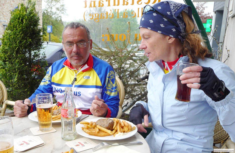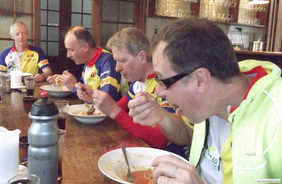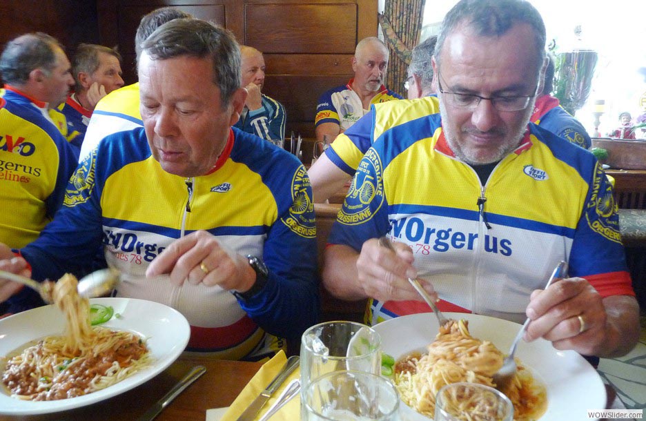 Repas sportif : ne pas trop se charger. Nan, c’est vrai, si on mange trop on est lourd pour regrimper sur le vélo.