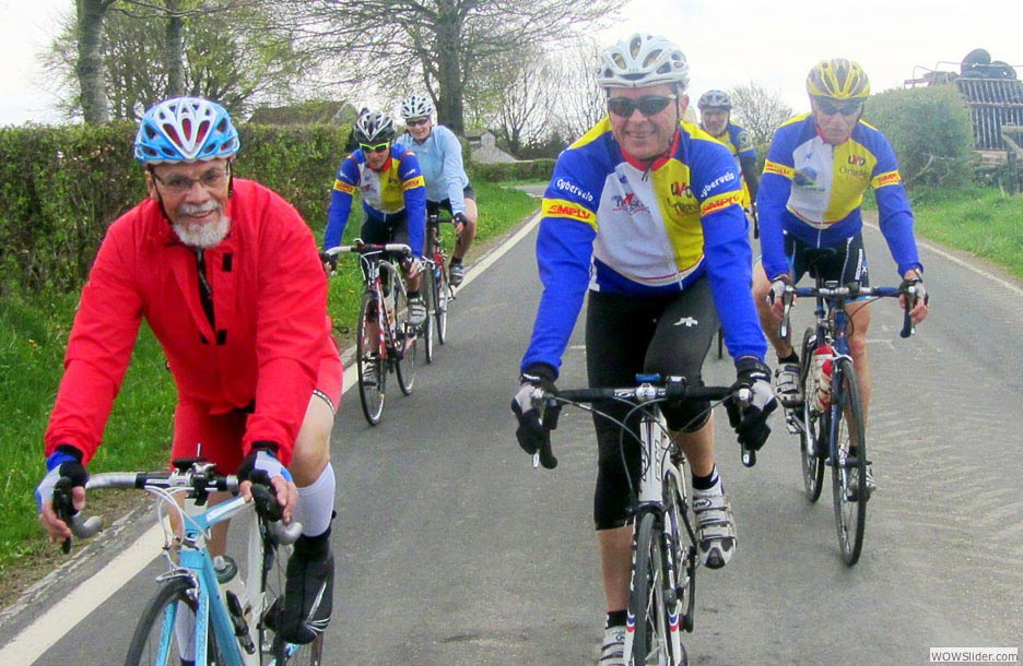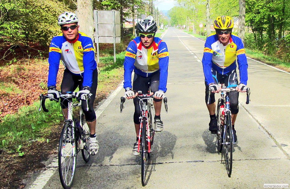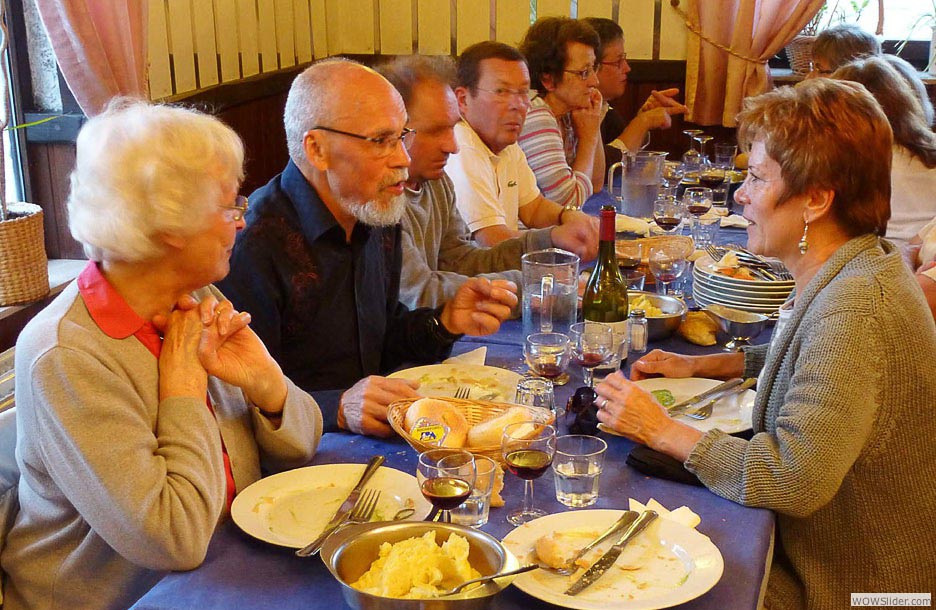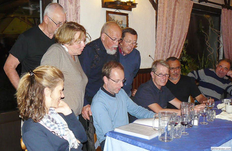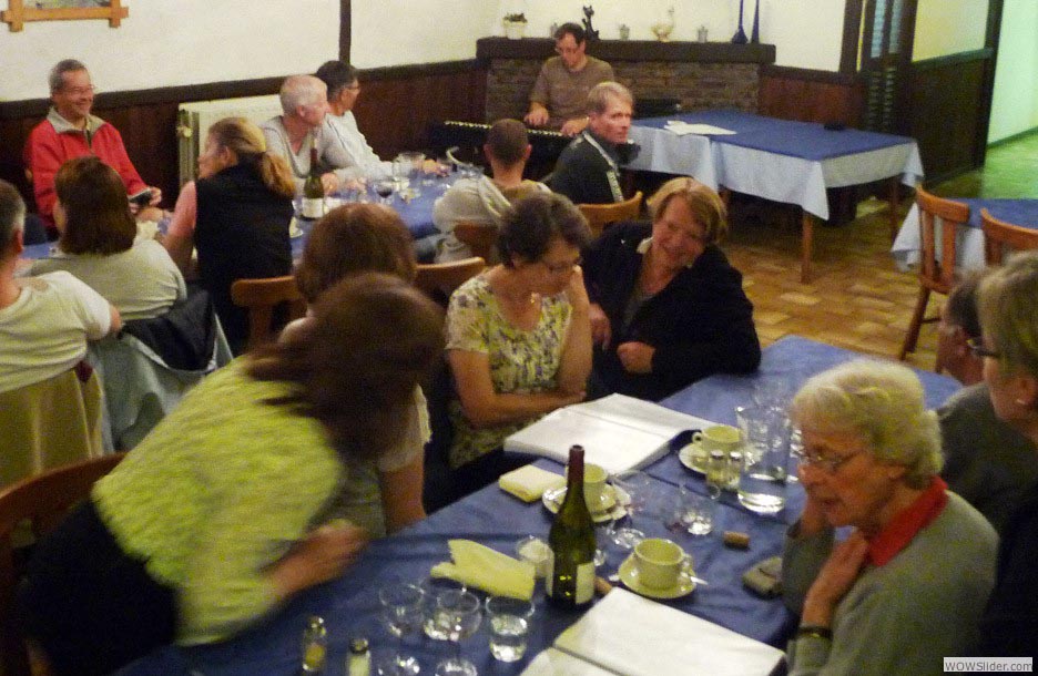 justement on était venus pour grimper, chacun avec sa motivation et ses objectifs. Trois jours de vélo. Trois jours de tourisme pour les épouses. Trois jours d’activités en tout genre, du briefing-apéritif à la table, de la table au vélo, du vélo au piano, du piano au chant. Trois jours d’amitié et de rigolade, clôturés par une soirée chorale bien chaude comme on les aime à l’UVO et qui gravent les souvenirs. Tout était parfaitement organisé, comme d’hab’ par le binôme Vincent-Daniel, chacun dans son registre… et par Louise-Anne, pour les riches activités des compagnes. Et que croyez-vous qu’on fit ? On pédala, bien sûr ! Et — soyons honnêtes et reconnaissants aux organisateurs — leurs accointances avec les cieux nous ont permis de rouler sans pluie ou presque : rien à voir avec le séjour d’il y a huit ans qui nous avait offert un millefeuille de tout ce qu’on aime comme situations météorologiques quand on pratique la bicyclette, trois jours au printemps… de la pluie continuelle, froide et pénétrante, poussée par les bourrasques, et entrecoupée de brouillards, de