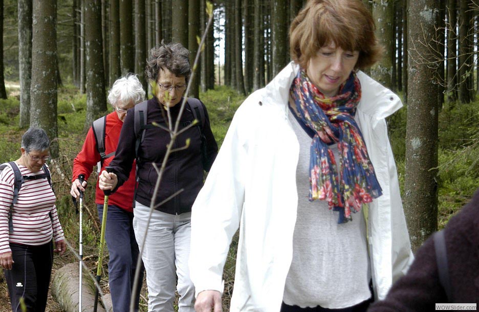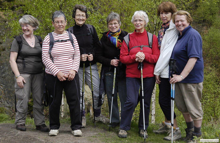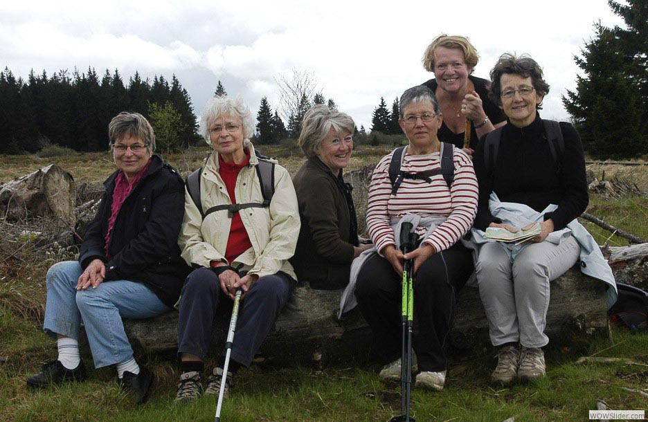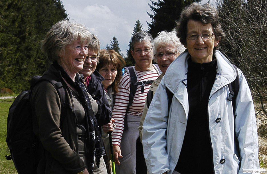 Donc, même à pied, elles pédalent assez fort dans la campagne... un peloton bien groupé. De gauche à droite, Fabienne, Claude, Maryvonne, Emilia, Colette, Louise-Anne. Marie-Laurence derrière l’objectif...