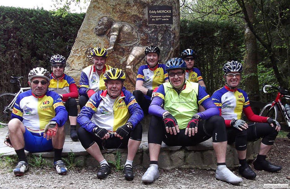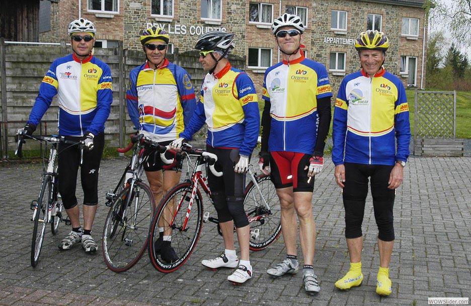 Le Stockeu n’a pas changé. Eddy nous attendait depuis huit ans... Le G1 version 2013. Dommage, les lunettes de soleil... ( :o)) ! De gauche à droite, Stéphane, Alain, Christian, Gégé — lui il sait qu’une photo c’est mieux sans lunettes de soleil — et Daniel. Les petits talus de Belgique n’ont qu’à bien se tenir : les cadors veulent bouffer du lion.