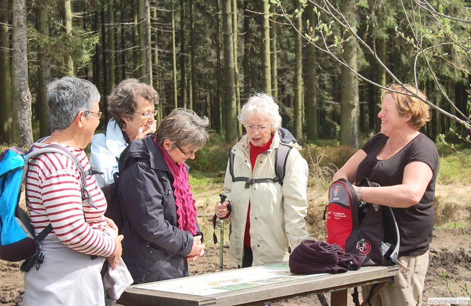 Il y a évidemment un groupe 3... il est loin devant ( :o))) ! Ici au pied de la Haute Levée qu’ils ont dédaignée pour s’attaquer à Wanne. C’est qui qui rit ? Bah, t’as qu’à essayer, tu verras... nous, au moins on est là ! De gauche à droite, mais un peu loin de la pancarte (on higole, touillours !) : Christine, Youcef, Claudius.