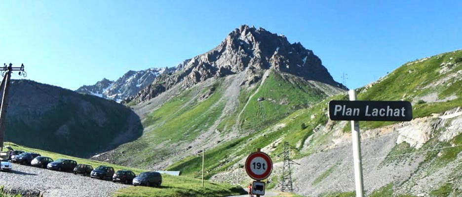 jusqu’au Plan Lachat, on passe de 1 420m à 1 960m en 9 km (6%). La montée est régulière, le paysage magnifique ; les marmottes sifflent mais restent invisibles, les clarines tintent au cou des vaches. Au Plan Lachat, la vision est suffocante : sur la droite les lacets slaloment dans une pente impressionnante. Et, plus loin, ces petits points qui rétrécissent sans cesse quand on lève les yeux vers le sommet, ce sont de valeureux cyclotouristes, comme nous. Il reste 8 km. Les bas côtés sont encore enneigés, le soleil tape