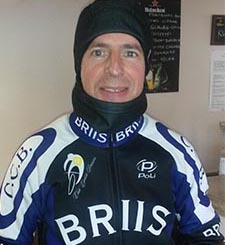 Départ de Flins à 7h45 sous un petit 5-6 degrés : pas mal pour un mois de janvier... Ah mince, on est au printemps, c’est vrai j’avais oublié ! Patrick, Jean-Louis, Serge, Éric, Guillaume et Vincent sont au rendez-vous, sans oublier Claudius et Youcef qui sont partis aux aurores pour faire ce BRM à leur rythme. Voilà donc l’équipe PBP constituée (non non Claudius, je ne « higole » pas, tu fais partie intégrante de l’équipe... dans le camping-car... moi aussi jusqu’ici... hihihi). Les 54 premiers kilomètres vers Cherisy sont avalés comme une gouleyante côte de bœuf saignante poivre vert, poussés que nous sommes par ce petit vent venu du N/N-E. Dès la côte de Maule, nous voilà rejoints par un cyclo tout de noir vêtu, qui se présente lors du premier arrêt technique : Luc de |
