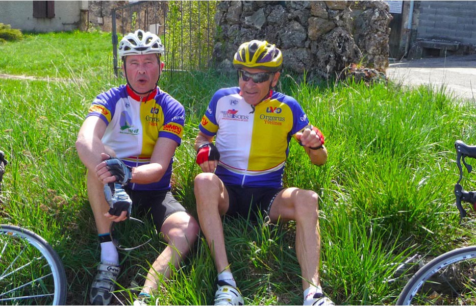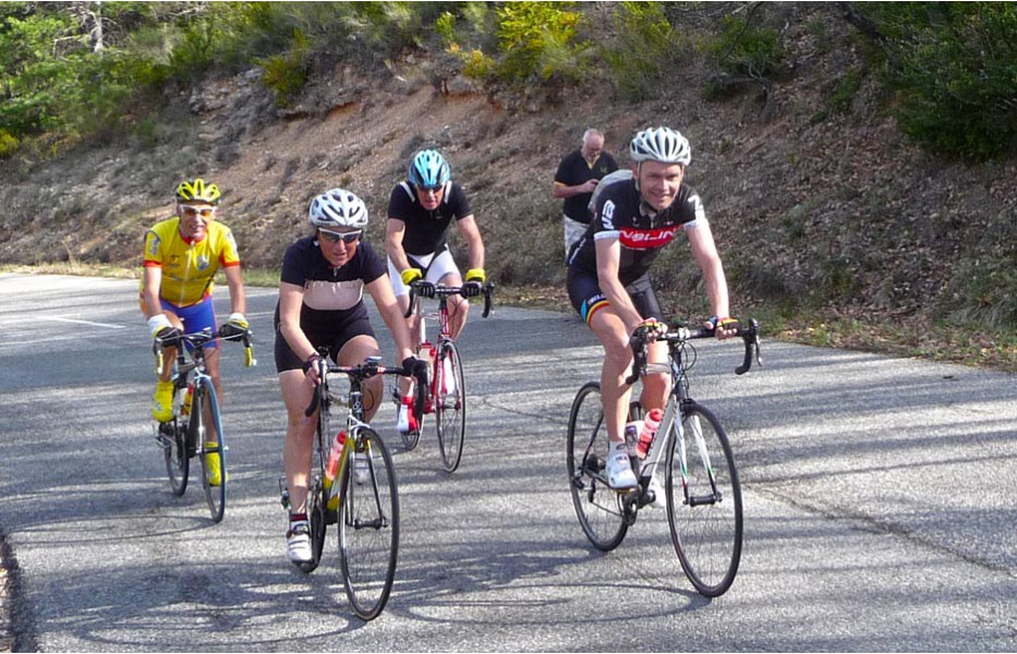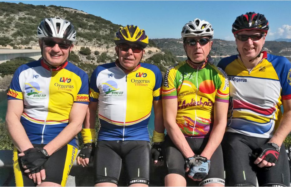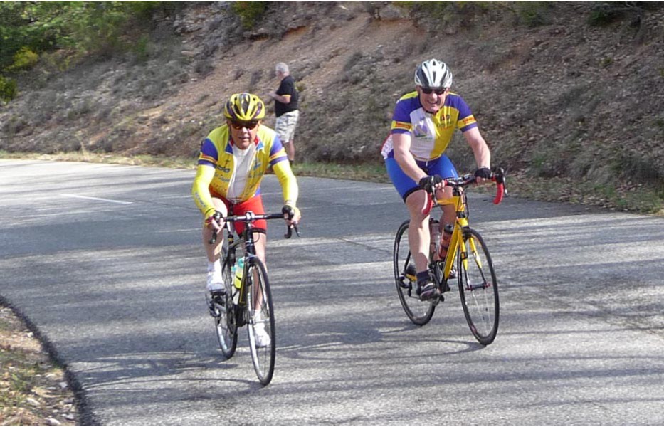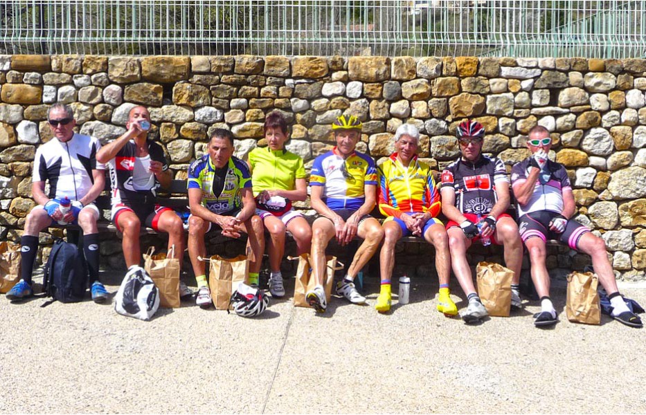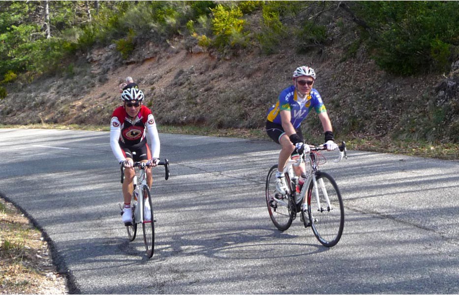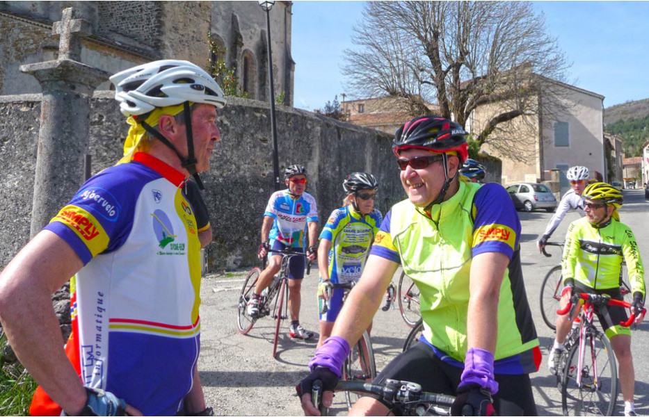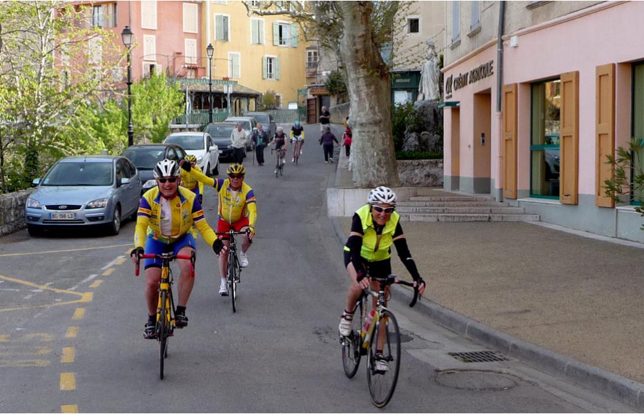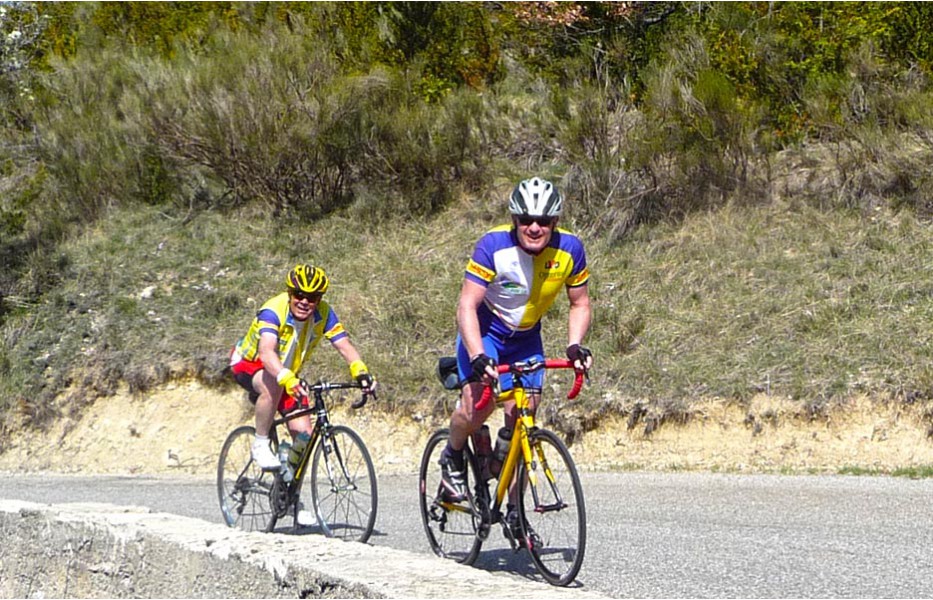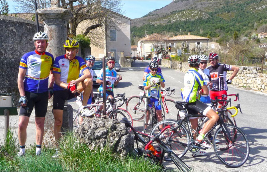 Depuis l’an dernier, « nos » Stages du Soleil se sont téléportés à Gréoux-les-Bains, top cinq des stations thermales françaises. Les eaux y sont réputées pour la rhumatologie et les affections respiratoires et la bière (à consommer avec modération) est excellente pour reconstituer le glycogène du cycliste (on higole… tout le monde à l’UVO se range à l’évidence et reconnaît, avec humilité, à la bière belge des qualités sportives, poétiques et musicales incomparables). Nous sommes au cœur de la Haute-Provence, aux confins des Parcs Naturels Régionaux du Lubéron et du Verdon. C’est attesté : le choix est excellent… pour le vélo et pour le tourisme. Le Château-Laval, ensemble installé dans un parc saisissant de 30 hectares, est notre camp de base. Parfait pour le repos du cycliste : piscine, sauna, hammam, terrasse, bar, etc. Situation touristique idéale aussi pour nos non-pédalantes — n’y voyons pas de vilain machisme, c’est comme ça, nos femmes ne pédalent pas, même celles qui roulent d’habitude au sein du groupe promenade de l’UVO. Mais elles s’entendent comme larrones en virée et marchent « dur ». Il y a de quoi faire. Elles ont passé un agréable séjour, ont-elle dit : promenades, visites, vitrines (attention aux épidémies de fièvre acheteuse), marchés forains, restaus, etc… Mais revenons à nos vélos. Le stage est bien conduit par une équipe enjouée de capitaines de route de l’Ufolep, organisée autour de Bernard. Les circuits visitent des sites superbes, |