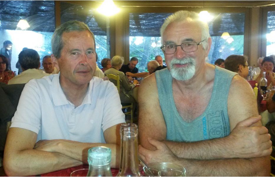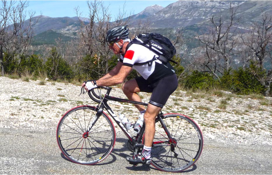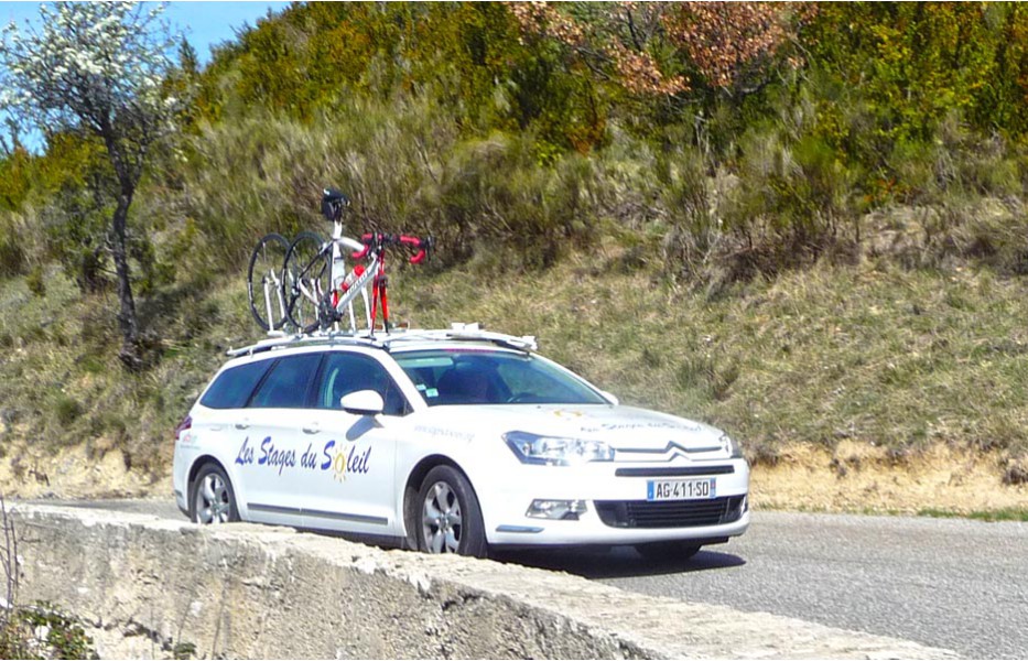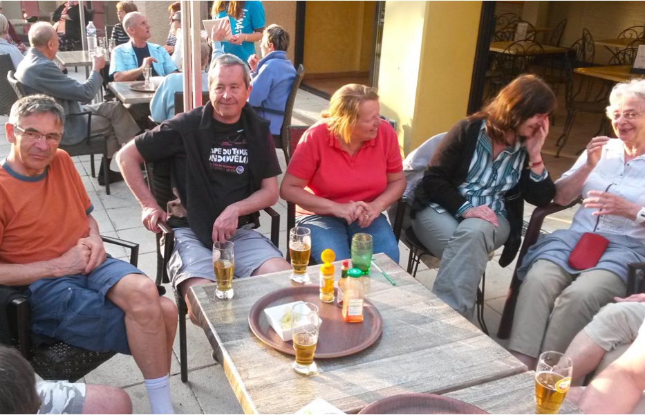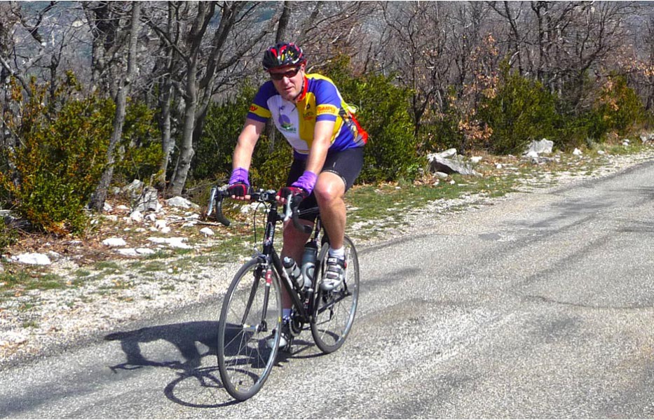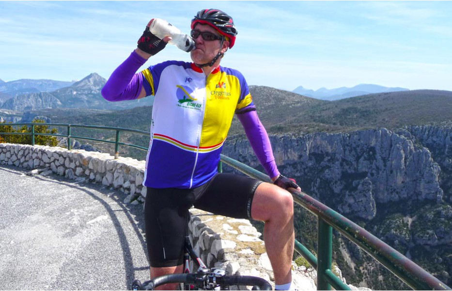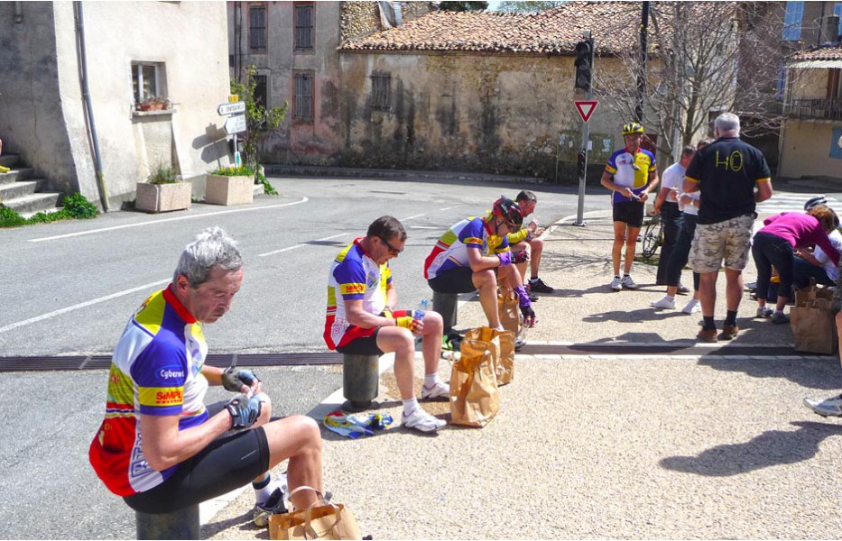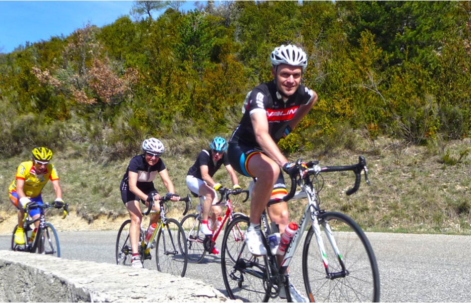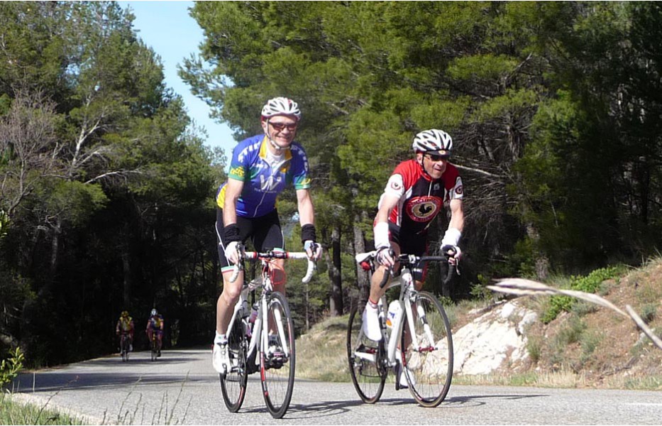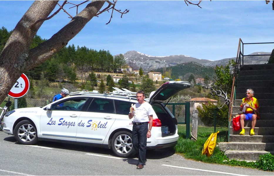 Depuis l’an dernier, « nos » Stages du Soleil se sont téléportés à Gréoux-les-Bains, top cinq des stations thermales françaises. Les eaux y sont réputées pour la rhumatologie et les affections respiratoires et la bière (à consommer avec modération) est excellente pour reconstituer le glycogène du cycliste (on higole… tout le monde à l’UVO se range à l’évidence et reconnaît, avec humilité, à la bière belge des qualités sportives, poétiques et musicales incomparables). Nous sommes au cœur de la Haute-Provence, aux confins des Parcs Naturels Régionaux du Lubéron et du Verdon. C’est attesté : le choix est excellent… pour le vélo et pour le tourisme. Le Château-Laval, ensemble installé dans un parc saisissant de 30 hectares, est notre camp de base. Parfait pour le repos du cycliste : piscine, sauna, hammam, terrasse, bar, etc. Situation touristique idéale aussi pour nos non-pédalantes — n’y voyons pas de vilain machisme, c’est comme ça, nos femmes ne pédalent pas, même celles qui roulent d’habitude au sein du groupe promenade de l’UVO. Mais elles s’entendent comme larrones en virée et marchent « dur ». Il y a de quoi faire. Elles ont passé un agréable séjour, ont-elle dit : promenades, visites, vitrines (attention aux épidémies de fièvre acheteuse), marchés forains, restaus, etc… Mais revenons à nos vélos. Le stage est bien conduit par une équipe enjouée de capitaines de route de l’Ufolep, organisée autour de Bernard. Les circuits visitent des sites superbes, |