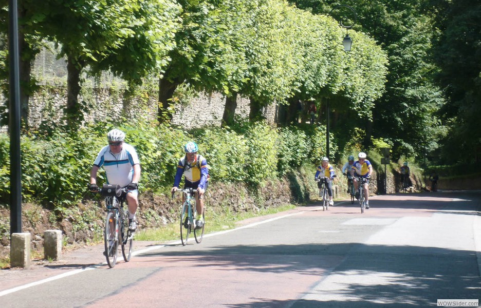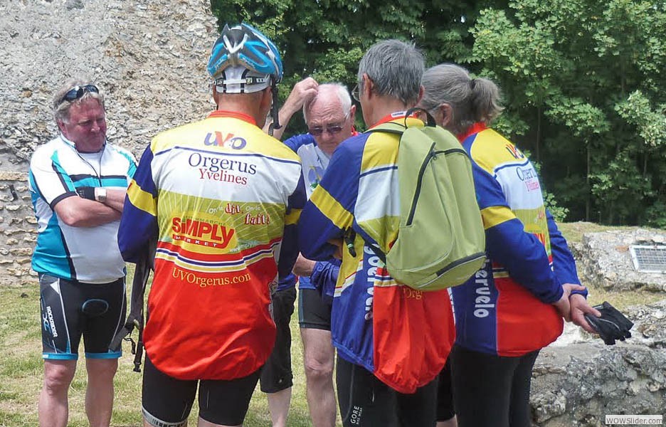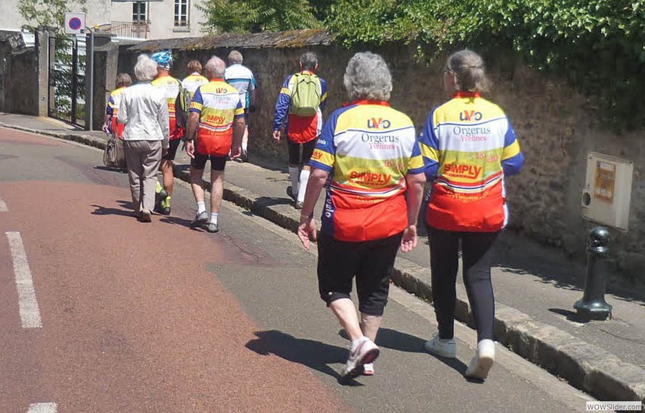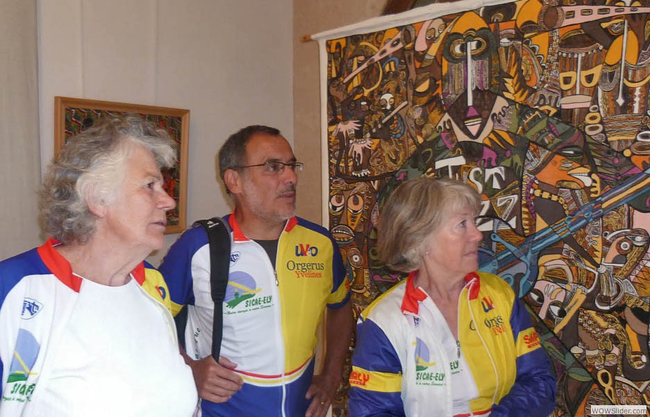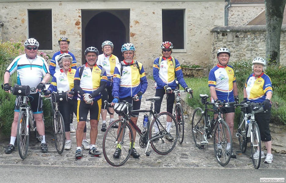 Une journée d'été — par grand soleil — idéale pour rouler dans la bonne humeur. Première étape à Vicq, au musée international d'art naïf. Découverte, dépaysement assuré. Très belle exposition, peintures, sculptures... et des visiteurs un peu particuliers en cuissards, maillots fluorescents et chaussures à cales… Jusqu'où n'irions-nous pas pour montrer le maillot UVO ? Ensuite, direction Montfort-l'Amaury et passage obligé sur les gros pavés « du Nord » pour rallier la place de l'église : il faut s'accrocher. Visite de l'église ; vitraux magnifiques. Le clocher sonne l'heure du ravito : Loïc avait réservé le resto sur la place. Repas en terrasse, tout va bien… pour digérer nous montons à pied au donjon pour découvrir les superbes panoramas. La région est belle. A découvrir (par temps dégagé). Nous voulions finir par la maison de Ravel, mais pas de bol(éro), c'était fermé. Retour tranquille vers Orgerus en fin d'après midi. Encore une belle journée du groupe — informel — «Tourisme à vélo». Avis aux amateurs.