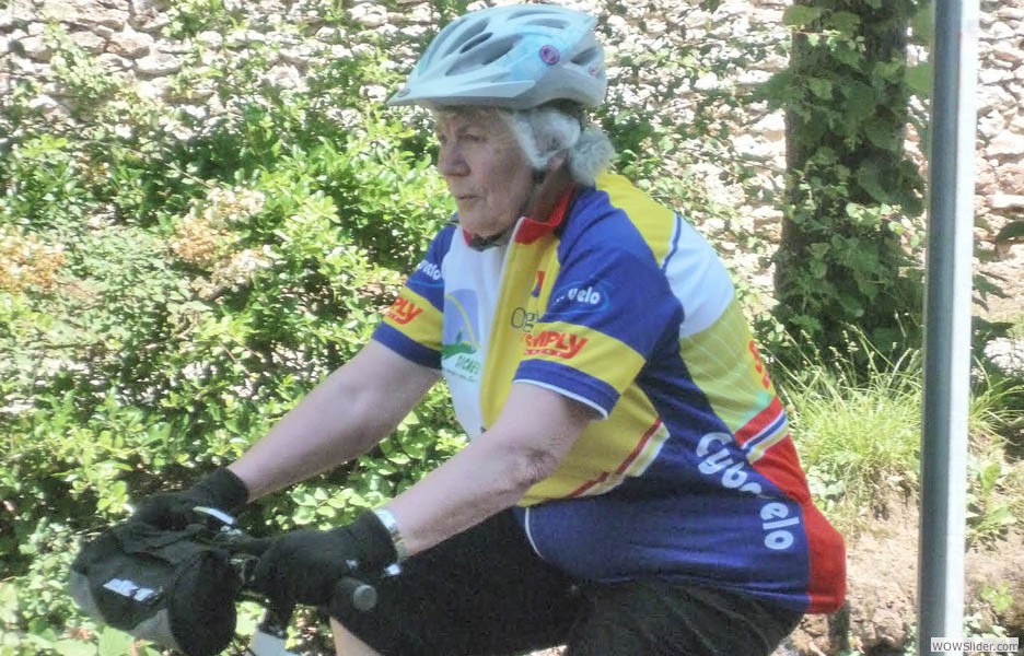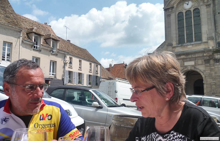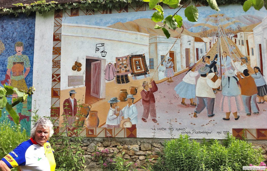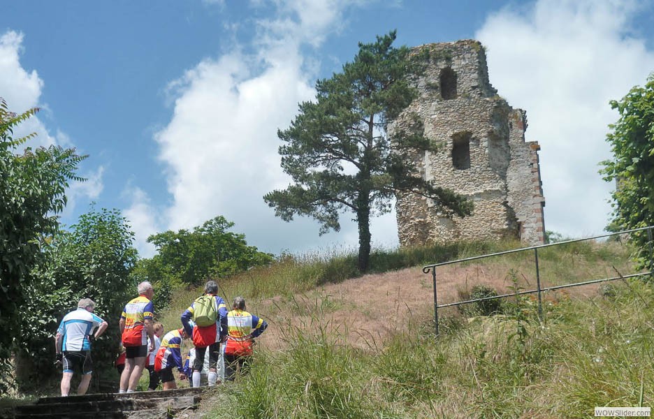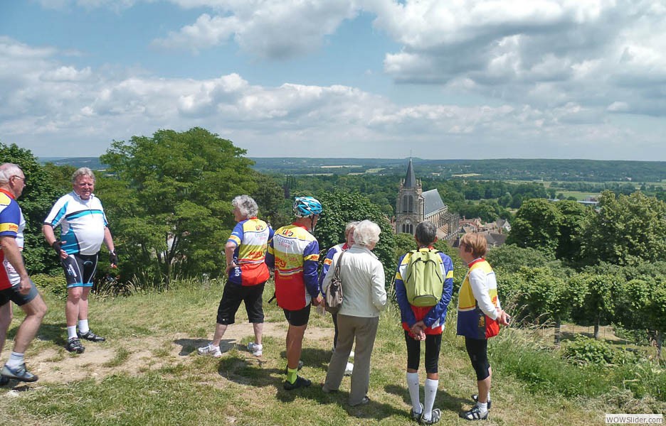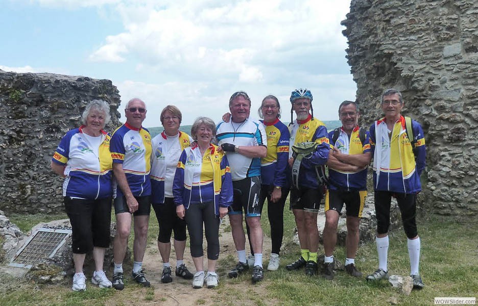 Une journée d'été — par grand soleil — idéale pour rouler dans la bonne humeur. Première étape à Vicq, au musée international d'art naïf. Découverte, dépaysement assuré. Très belle exposition, peintures, sculptures... et des visiteurs un peu particuliers en cuissards, maillots fluorescents et chaussures à cales… Jusqu'où n'irions-nous pas pour montrer le maillot UVO ? Ensuite, direction Montfort-l'Amaury et passage obligé sur les gros pavés « du Nord » pour rallier la place de l'église : il faut s'accrocher. Visite de l'église ; vitraux magnifiques. Le clocher sonne l'heure du ravito : Loïc avait réservé le resto sur la place. Repas en terrasse, tout va bien… pour digérer nous montons à pied au donjon pour découvrir les superbes panoramas. La région est belle. A découvrir (par temps dégagé). Nous voulions finir par la maison de Ravel, mais pas de bol(éro), c'était fermé. Retour tranquille vers Orgerus en fin d'après midi. Encore une belle journée du groupe — informel — «Tourisme à vélo». Avis aux amateurs.